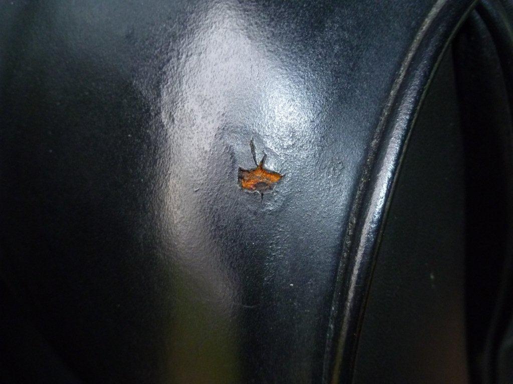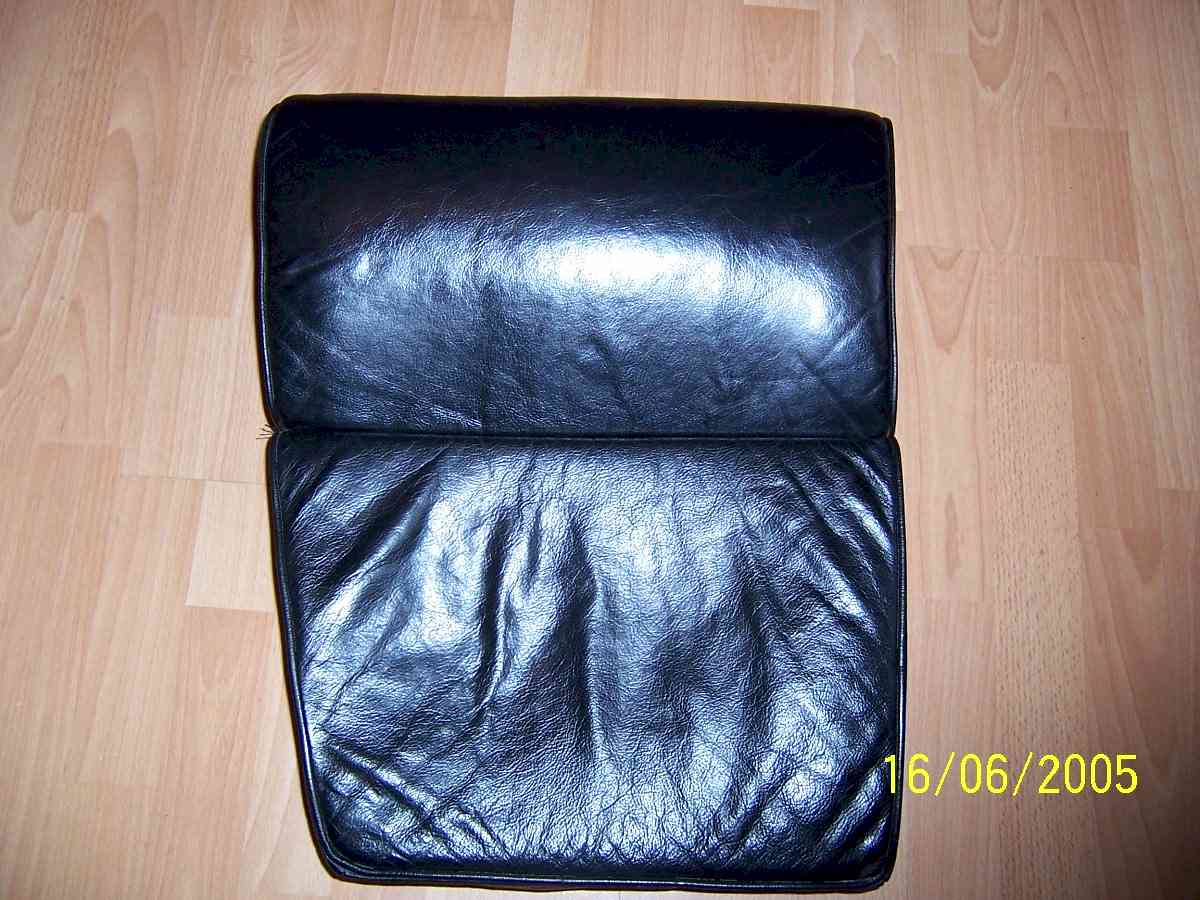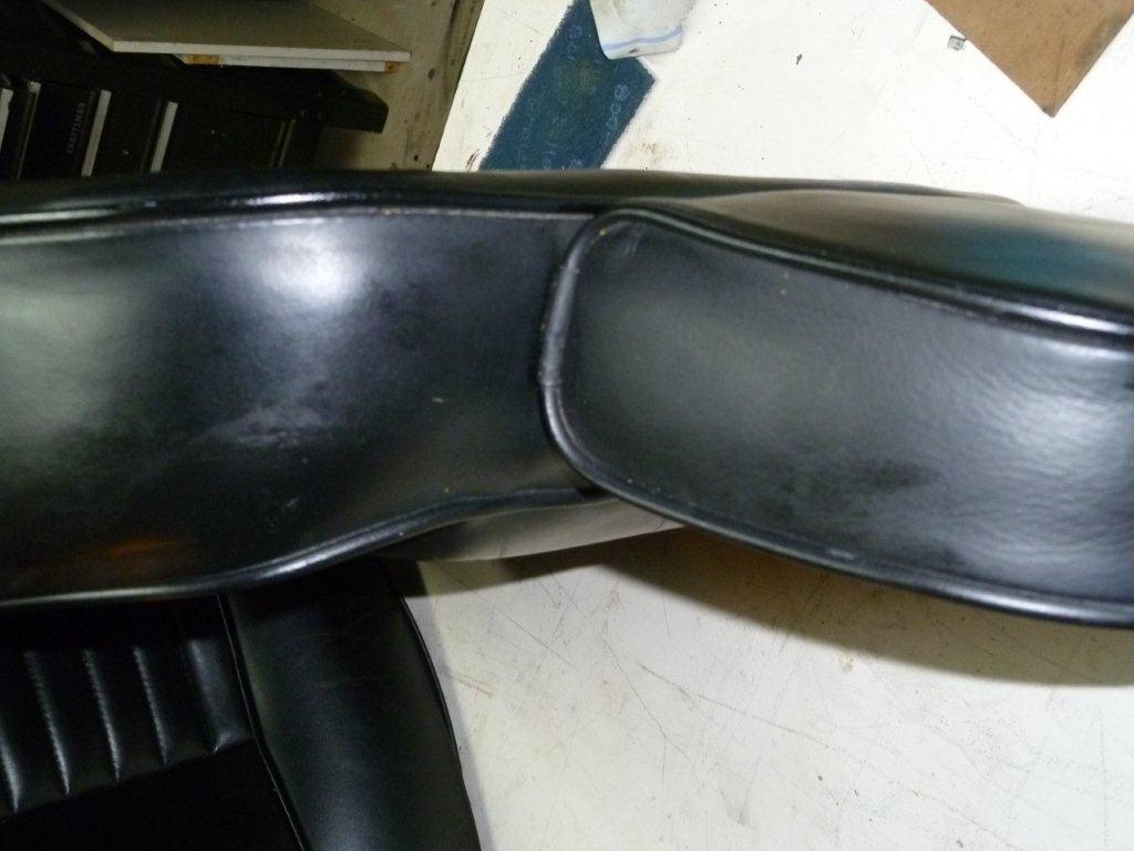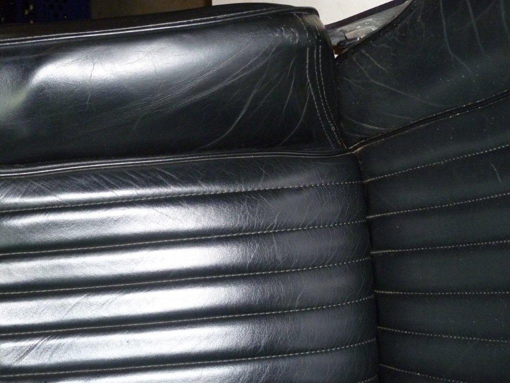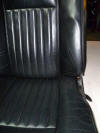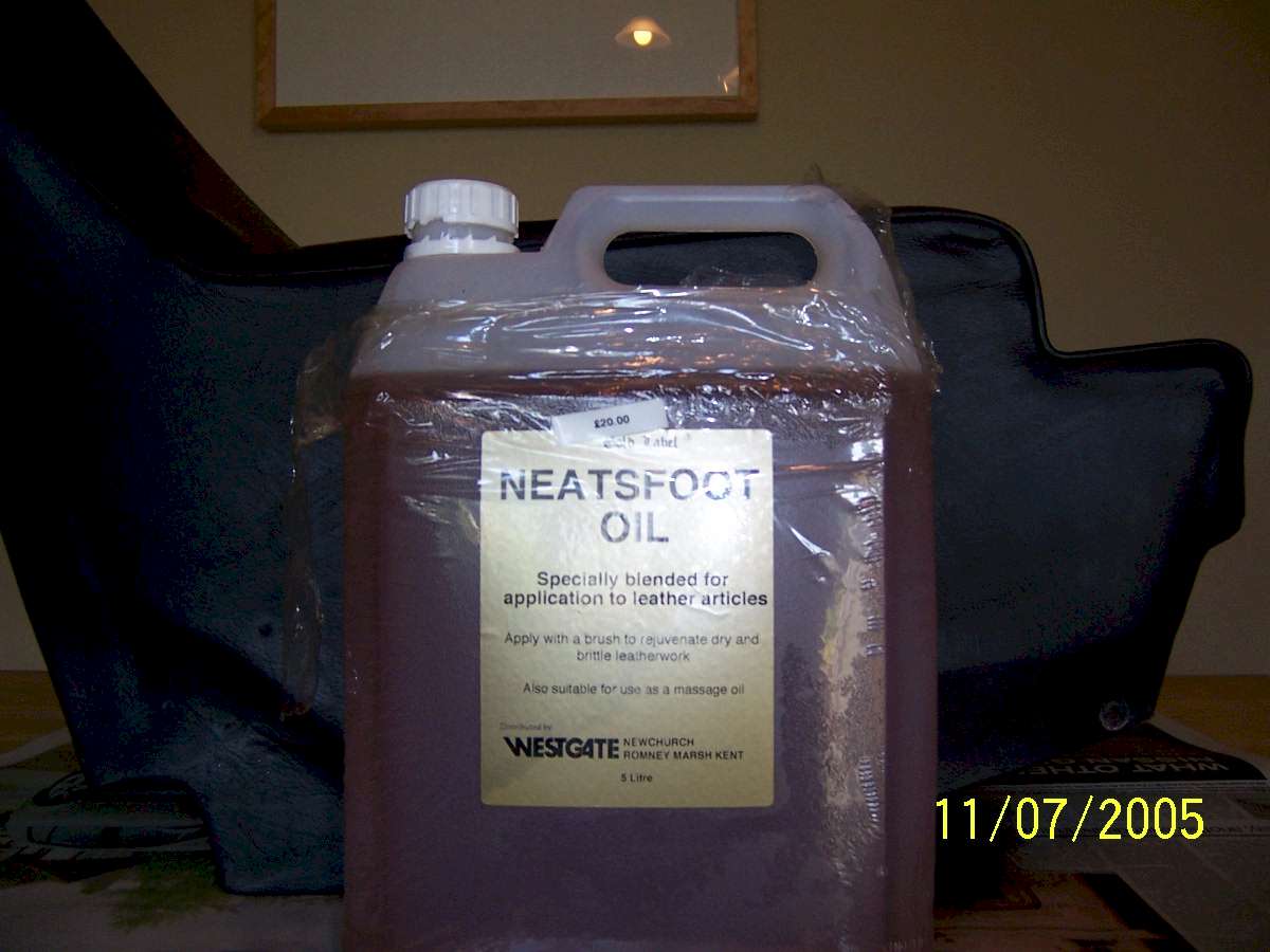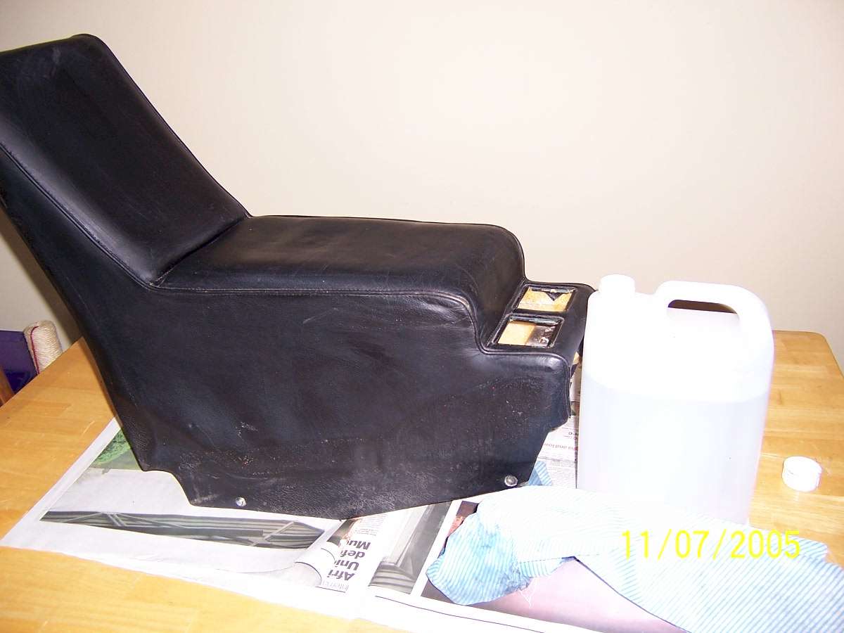 The de-natured alcohol came courtesy of my make Dick who is an industrial chemist. When I asked him what it was, he said "Alcohol with an emetic added to stop tramps like you from drinking it". Cheers mate! Neats foot is the oil used by saddlers to soften leather. Neats is the old English name for cow, and it is made from rendered down cow's hooves, or "Neatsfoot". I brought a gallon from my local saddlers. If your leather is dry I would recommend you use hide food to feed it for a couple of weeks before you start the job to save time having to apply multiple coats of Neats foot. Some panels took 8 coats of Neats foot before they would stop absorbing it, so it slowed the process down. The first job is to remove the interior. Most of it is straight forward, but there are 2 tricky bits. The first is the rear speaker covers. The edges of these are held in place by the rubber door surrounds. Pull away the surround, then using a thin bladed knife, ease it between the leather and the body work to break the glue that holds it down. Once it is pulled away from the body, you will see a wooden batten with a self tapping screw in it. You need to pull the leather quite far away from the body to reach the screw, and if the leather is dry, it will rip at this point. Both mine had been ripped by the P.O, so they are both being recovered. The other tricky bit is the rear seat backs. They are held in place by wing nuts in the boot. You will have to remove the carpeted board that covers the fuel expansion tank to get to them. Once you have the interior out, the restoration can begin. Here are before and after pictures to show you the results: