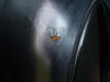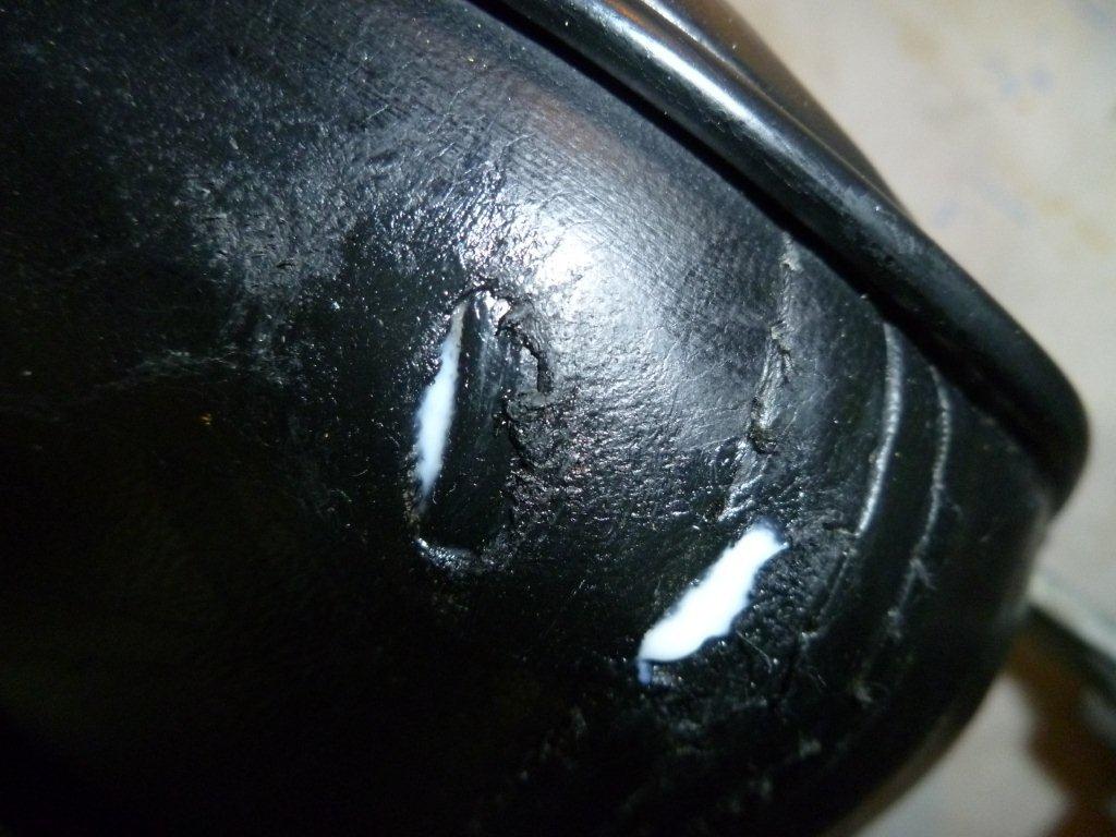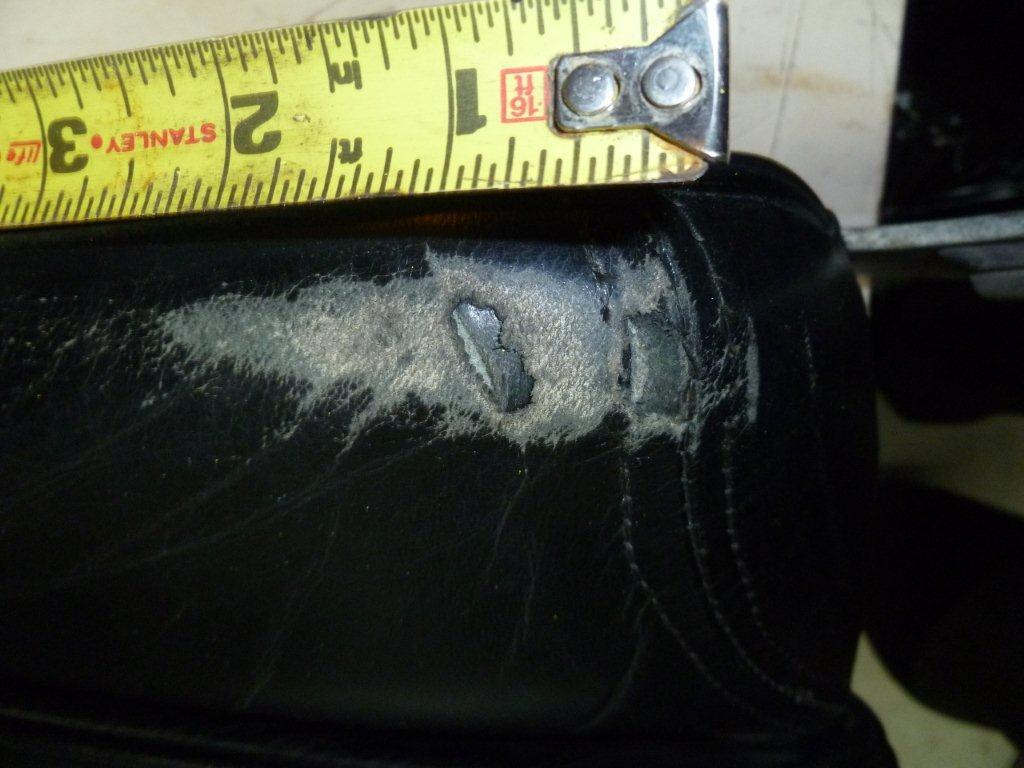 After restoration, the leather is much softer, and has a nice well cared for "old leather" look to it. The restoration process goes like this: Clean the leather thoroughly with the denatured alcohol. This will remove all the dirt and some of the old dye, which will make the new dye adhere better. If you find minor scratches or marks, gentle rubbing with very fine emery cloth or wire wool will remove them. If you rub to hard, you will remove the grain of the leather and you will have odd "flat" parts that look out of place. The next step is to use the leather cleaner from the kit. The leather will be very clean from the alcohol, but this will remove any residue from the alcohol, and it also softens the leather. You can now treat the leather with the Neat's foot oil. If you read the label carefully, it says it can be used as a massage oil. I don't think so! Some panels took up to 8 coats before it will stop absorbing the oil. After the leather will not take any more Neat's foot, use the Woolies cleaner again to remove any left over oil. You can now start applying the dye. The instructions tell you that you can use 2 methods to apply the dye. The first is with a soft cloth which is supplies with the kit. The second is with an airbrush. I was concerned that the cloth would leave brush marks, but even though there are marks when you out it on with the cloth, they completely disappear as the dye dries. I gave each panel 2 coats. You may need more if the old dye has been worn off, or if you are doing a colour change. The last process is to apply the sealer. This is an abrasive wax that acts like "T Cut" car polish, and gives the dye it's shiny finish. It also fixes the dye in place. Don't rub to hard as you will rub the new dye back off! All that's left is to reinstall the interior. You can use the Neat's foot to feed the leather every 6 months or so, and pay special attention to the panels under the read window as the sunlight dries these very badly. The kit has more than enough to do a complete interior, and is well recommended. We have had a contribution from Mk2 owner Patrick in Canada with his experiences in leather restoration. See details below. Monty Python is a MKII Interceptor used as much as possible in Montreals short summer season. I aim to keep the car in presentable condition for local shows. I have no ambition to be the owner of a point hunting trailer queen. Monty Pythons leather interior is in good shape, the seats are, Lightly Patinated the leather is flexible, well fed, with no cracks. There were however two problem areas, a small hole in the passenger seat near the head rest And a damaged area of the drivers seat outboard kidney bolster caused by the previous owners mobile phone holster There are not many trimmers in the Montreal area, they were all unwilling to give a firm estimate, or commit to a schedule for the repairs. Faced with an uncertain cost and schedule for repairs and the knowledge that Monty Python is definitely NOT Concours material, I looked for an alternative to whole sale interior refurbishment A retired upholster who had worked with leather furniture suggested that the scuffing could be treated by light sanding and the liberal use of scuff repair shoe polish. He also suggested that the holes could be filled with paintable transparent silicone sealer, the type used in bathrooms . The technique is to apply the sealer in very thin layers, allowing each layer to cure completely before adding the next. I used a sealer which is white when applied and is transparent when fully cured. The picture shows the first application of silicone The final results are shown: Passenger seat hole repaired Drivers seat bolster repaired The repairs look even better in real life than they appear in the pictures. The cost of the repairs was negligible . To balance future wear on both seats I have interchanged the drivers and passengers seats. The heavily worn bolster is now on the inboard side of the passenger seat, where it will be exposed to less stress .
