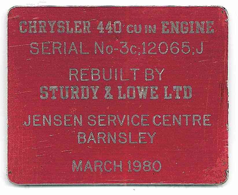 In the intervening years it has lost: The yellow paint, the vinyl roof (VR), the rear seats belts, the Voxson (VX), and now bears the registration "MHE 242 M" . The registration number change is due to the car wearing a private registration plate for many years. It also lost its original engine, serial number 3C 11703, and was replaced by serial number 3C 12065, which was built in March 1980 by Sturdy and Lowe, a Barnsley based Jensen specialist. The reason for the engine swop is unknown.