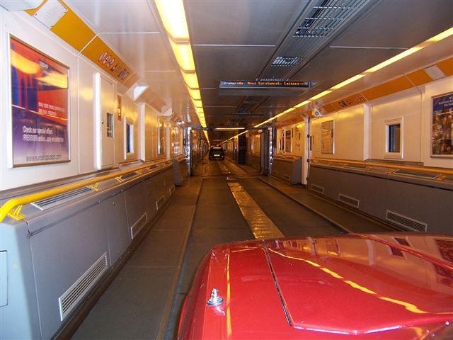 At 1:30 the car was backed out of the garage, with a 5000 mile adventure awaiting. After all that fettling and servicing, the first thing I noticed was that one of the number plate lights was not working. A swift kick resumed normal service, and we were on our way. For 5 miles then the fuel gauge packed in... No mind, we turned the stereo up and we didn't care. We had pockets full of cash of every denomination, credit cards aplenty, and we weren't afraid to use them. We took a satellite navigation unit which cover the European Union countries, but after that it was back to maps. We had been told about The Map Shop , which was: A. Astonishing with maps of just about everywhere in any scale. B. Just down the road from where I live so nice and easy to get too (I have actually moved to the town where the map shop is located since writing this blog!) . We had stocked up with maps, and as a bonus there is an old fashioned sweet shop around the corner that does all the stuff you haven't seen since you were a kid, and a cracking fish and chip shop, so we had to have some. Well, it would have been rude not too! Unquotable quote: "There be dragons..." The journey to The Tunnel was uneventful, and we rocked up in plenty of time. The Tunnel is one of the great engineering feats of the world, and takes just over 30 minutes to cross the 23 miles from Britain to France, underneath the sea. Quite remarkable. We drove into the train and prepared to leave.