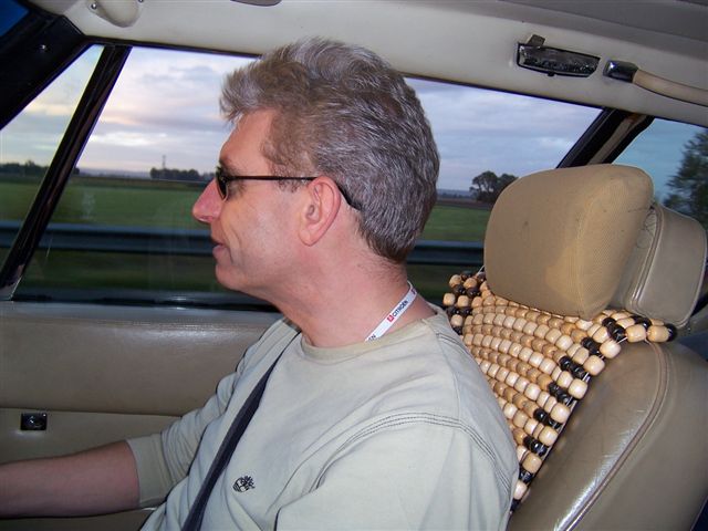 Top Touring Tip 1: Don't sit on your wad. We were going to leave in the early hours of Saturday 30th of September to catch the 5:30am "flight" (as they like to call it) of the Channel Tunnel to Calais, France. So on the Friday evening Kate took me over to Chris's house, and along with Chris and his wife Elspeth, we had a farewell meal. It didn't feel like the last supper, but as we parted Kate broke down in tears at my imminent demise. Good start then. We managed to go to bed at 10pm, with the alarm clock set for 12:30 ready to leave for the Channel Tunnel. Chris had already packed the car, so a quick cup of tea and an e-mail to the Jensen mail list, and we were on our way.