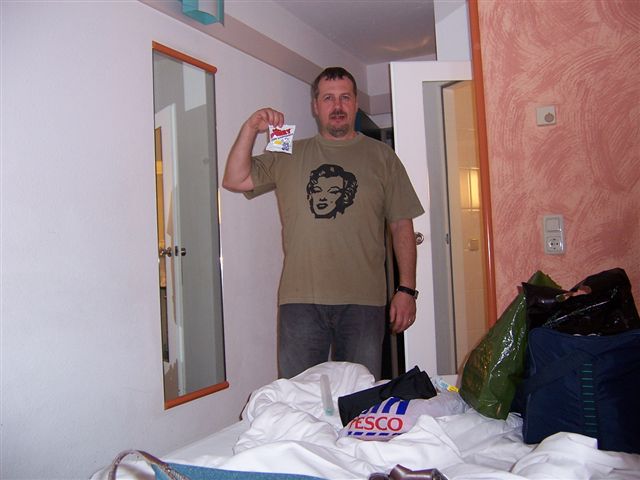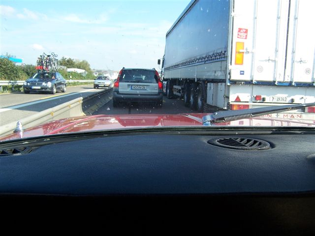 You're not supposed The day was getting hotter and hotter and we hit a traffic jam. With the air conditioning on, the temperature gauge started to rise... No mind, we turned the stereo up louder and took no notice. Chris claimed these birds were buzzards, but they looked like bloody vultures to me! It was a very tight squeeze through the narrow lanes of the road works... and the congestion wasn't helped by people gawping at Concorde, and the Russian version Concorde-ski, side by side at the nearby air museum. This slowed us down a lot, and we got to our first nights destination much later than we had expected, but a pint of ice cold wheat beer soon cheered us up!