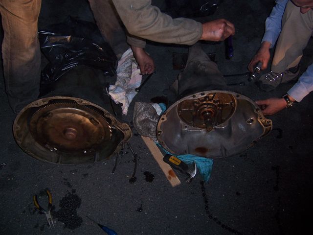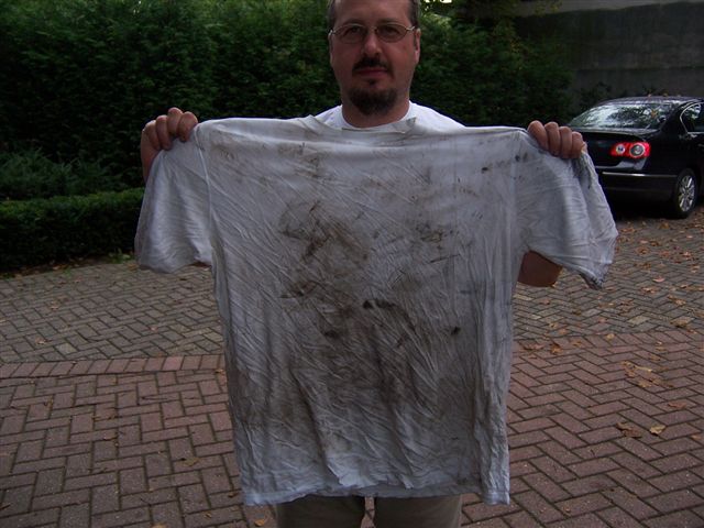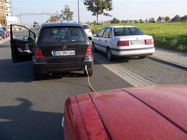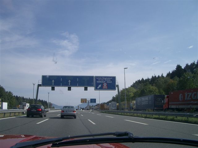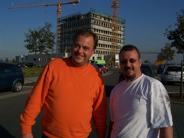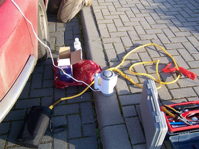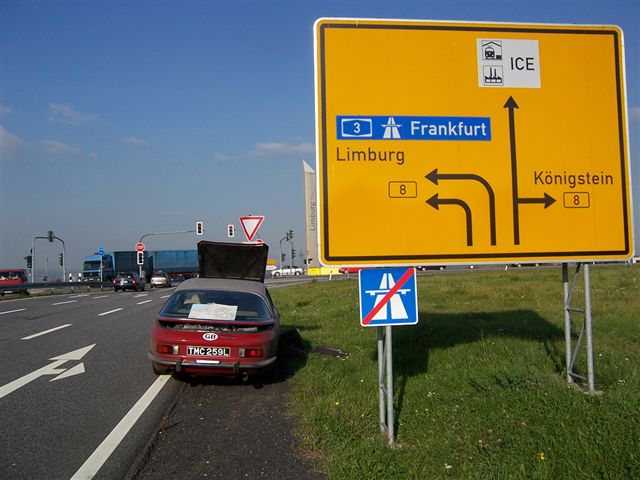 Top Touring Tip 10: Always have Steve "Mehmet" Payne's number handy So far we had done well over 4000 miles, with nothing much to speak of in the way of car troubles. We had had a tyre lose pressure from the beating it took in Bulgaria, we had lost a bit of the rear valance in Istanbul, and an aircon drive belt in Serbia, but all small beer in the scheme of things. What we had had was an ever increasing noise from what sounded like the rear of the car. This was now reaching the stage where it sounded like John Bonham practising Moby Dick in the Grand Canyon. What could we do? Nothing but press on and keep our fingers crossed. We left the Czech Republic after passing the Skoda car works and were back into Germany. The border crossing was a model of efficiency and politeness, and we were once again on the fast German autobahn. Unquotable Quote: "...air conditioned rubber skiddies" Our destination for what was meant to be our final night was Belgium. We had a reciprocal education programme going, with Chris teaching me about fine cigars, and me teaching Chris about fine beers. I had told him of the excellent beers to be had in Belgium, notably the Tripple style, and especially the 9.5% ABV, Westmalle, a trappist ale. We were aiming to go to the Hop Duvel cafe in Ghent, which is a great favourite of mine. We had travelled about 10 miles from the border when a German police car pulled in front of us and made us pull into a service station. As we were not speeding, we weren't really sure what was going on, but fearing a "rubber glove" incident, we didn't take any pictures. For the first time, including at borders, they really searched the car. The had all the boot out, and everything in the interior of the car, searching all the bags and baggage. They quickly asked if we had any alcohol or drugs, before getting onto tobacco. They wouldn't let go of the idea we were smuggling duty free tobacco from Turkey. Whether this is a major problem in Germany we don't know, but the car got a thorough search. As we had nothing other than a couple of Cuban cigars (good job they were German and not American police!), we were on our way, with the rubber gloves still in the police car. Everything was going fine, with nothing but the noise from the rear of the car to spoil our anticipation of a night in the Hop Duvel. We pulled into a service station for one last fill up of 100 octane fuel, which would blast us all the way to Ghent. A German motorist in a very potent looking Mercedes pulled up along side us, looked at the Jensen, and said "Eine schnelle Maschine!" It was with that 100 octane juice in it. We pulled out of the services with Chris at the helm, and almost immediately he said "look behind us". There were plumes of smoke pouring out of the rear of the car. We immediately thought of the engine, but all the gauges were normal, and the car was running fine. There was an exit slip road very near so we pulled off. This was the only time the German sign for exit didn't receive a chorus of "aus- FART!" We pulled over as far as we could on the slip road, and put out the obligatory warning triangle. Chris looked underneath and the problem as easy to see. There was oil pouring from the gearbox and running onto the exhausts, causing all the smoke. We only had a vague idea where we were, so we took a picture for reference It was at this point that a Mercedes "A" Class pulled over, and a very nice German guy by the name of Martin Hoercher got out. He introduced himself and told us that Jensens had been his fathers favourite cars and that as a boy his father had told him all about Jensens and would point them out whenever he saw one on the road. He felt that it was only right to stop and help us because of this. What are the odds of the son of a German Jensen fan happening to drive past a stricken Jensen on a motorway slip road in who knows where? Not as long as you think apparently... Out came the tow rope, and we were off the motorway A few hundred yards up the road was a building site near Limburg train station, and so we pulled in here. We thanked Martin profusely, and he was on his way. Chris and Martin. If you look up "Very Nice Man" in the dictionary, there is a picture of Martin It was 4pm and we were less than 500 miles from home, less than 200 from the Hop Duvel, and after all this way, we had broken down. Bugger! We didn't even know where we where, just close to Frankfurt. The car un-drivable, and it wasn't looking good. Bugger! We were going to fail... At this point I looked down, and saw that Chris had done what the British always do in times of crisis. Put the kettle on for a nice cup of tea. It doesn't matter how grim the situation, if you're British, you put the kettle on. The very words "I'll put the kettle on" stiffens the upper lip, adds steel to the backbone, and strengthens the resolve. It was when I saw this that I knew, no matter what, beyond a shadow of a doubt, and as sure as eggs is eggs, we would NOT be going home on a trailer. We sat and had a brew and a sticky bun and made plans. The plans involved getting the old gearbox out, and putting a new one in. No much to ask really?