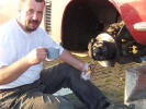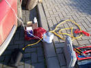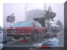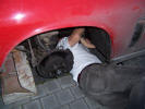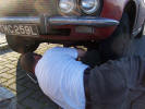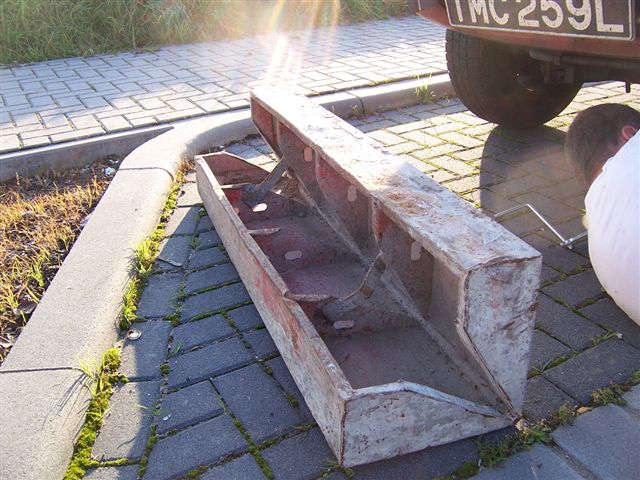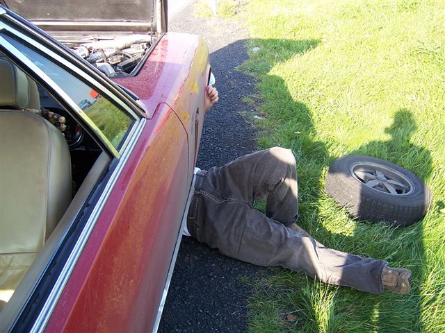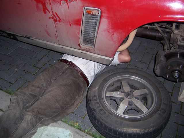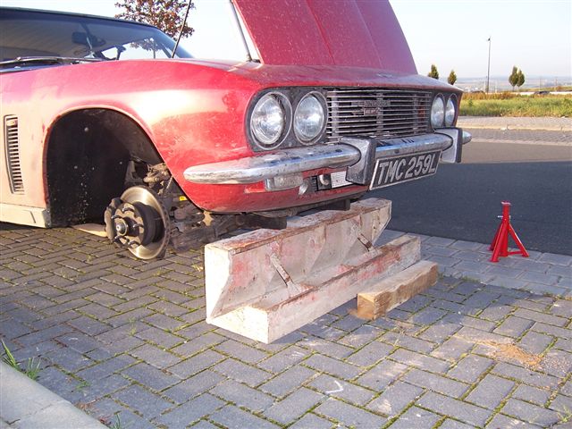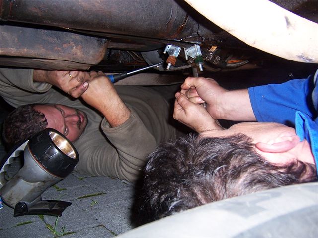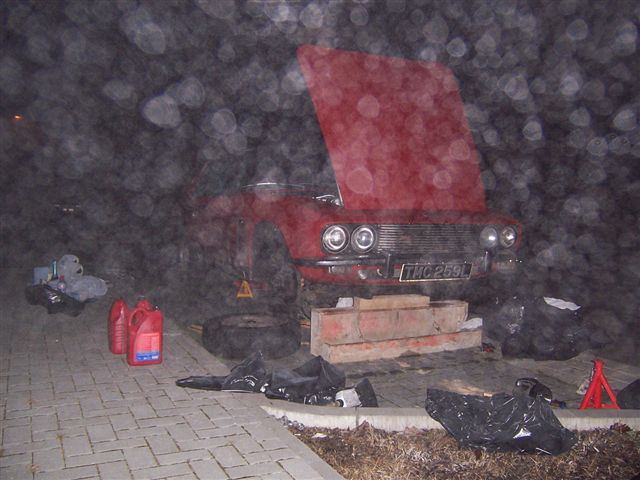 Unquotable Quote: "Women in Hungary can't drive either" We needed to get the car off the ground so we could get the gearbox out, but we only had 1 ton scissor jack, and a 2.5 ton car. It was then we looked around and saw piles of building materials. There had to be something amongst that lot we could use surely? We didn't know what this was, but it would do for a start We started to slowly lift the front of the car with the scissor jack and got the thing underneath A bit more jacking and we got some timber under as well There was no stopping us now other than we needed a new gearbox. Remember my mentioning "Mehmet" in Istanbul, the lowly waiter who had to do all the fetching and carrying, and how we were planning to use Steve Payne as our Mehmet on our return? Well it was going to happen a whole lot quicker. Our sales pitch to Steve was that we needed him to put a gearbox in the boot of his car, drive to the English south coast, get on a train and go 31 miles under the sea, and then drive to somewhere in Germany near a train station, went something like this: Chris: Hello mate, what you up to? Steve: Just finishing work. How's the trip going? Chris: Got a bit of a problem mate. We are hoping you might be able to help us... And so we broke the news to Mehmet, sorry Steve, that instead of steak and chips for dinner, it would be service station sandwiches and a blast to the continent. We worked away until it got too dark to see Chris had had the good sense to pack a couple of blankets and pillows in case of emergency, and after it was too dark to work we huddled in the car and tried to get some sleep. The days were lovely, but the nights were bitter cold and damp. Steve eventually arrived at about 1am the next morning, bringing the gearbox and some much needed sandwiches and drinks. We used the headlights of Steve's Saab to get the last few bolts out and get the gearbox out so Steve could take it back with him Steve stayed with us for as long as he could, helping out with swapping over pipes, etc. We told him about the new name Mehmet and he was heard to chunter "It ought to be Sir bloody Mehmet after this, whinge, moan, bitch, grizzle...." So to Sir Bloody Mehmet, and hearty and genuine thanks. We wouldn't have made it without you. After Steve left about 4am it was too dark and cold to work, so we got under the blankets to get some kip. We were dozing nicely when I heard a car pull up beside us. I opened one eye: Kerry: Sh*t Chris: What? Kerry: Rozzers Chris: No! Kerry: Yes Chris: Sh*t! The old Bill had pulled up and were looking goggle eyed at the car. Here we go again for the rubber gloves... I wasn't getting out as I was toasty under the blanket, so Chris got out. After checking passports and car documents they went on their way, and we nodded off again. Until someone drove up and stole some plastic chairs that had been left at the side of the road. The early morning traffic of commuters using the train station woke us up to this stygian vision of gloom... By god it was cold and damp. There were vending machines in the train station and they were our main source of food and drink during this, so I wobbled off to get some much needed hot coffee. We waited until the sun burned off the mist, and got stuck in. The building site foremen came and asked us to make sure we put everything back we had used, and we thanked him for the loan of the equipment and assured him we would All things considered, it went very smoothly, and 23.5 hours later, at 3:30pm, without the aid of a safety net, a method statement, or a risk assessment, we fired her up and drove around the train station car park. We had done it. One of the German brickies asked us if the car was ok, and when we said it was he broke into a big smile. I think the guys on the site were running a book on whether we would succeed or not, and I think he had just won a few Euros. We washed and changed in the most complicated automatic toilet we had ever seen at the train station, and we were ready to go. We took it steady for the first few miles to bed everything in, then speeded up a bit, then a bit more, then we were back to full speed. We felt we had more than earned a few beers in the Hop Duvel and sped into Ghent, passing a couple of loons on the Belgian motorway who loved the Jensen and trailed us for miles waving and smiling at us. I think they were stoned, drunk or both, but they were having a good time. I had stopped in Ghent 3 times before and had used the hotel Astoria. I go to Belgium as often as possible with my mates to try all the best beer cafes and breweries, and we had stayed at the Astoria all the times we had gone before. The owner had remembered me on previous visits, but not this time. He asked if I had stayed before and when I said yes was surprised he didn't recognise me. As I was sporting "Dave the Do" it was hardly surprising. We legged it down the road to the Hop Duvel and a big feed and some well earned beers. Chris was introduced to the delights of Belgian beer, and is now a fully paid up Belgian beer connoisseur, and I had a prawn curry, which was fantastic. We had planned to make a long night of it, but were shattered by the lack of sleep and hard graft of the day, so we quietly sauntered home just gone midnight, going out on our last night with a tired amble rather than a bang. Go to: Day 12. The Voyage Home.