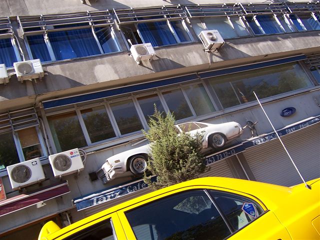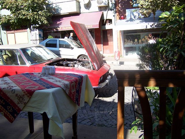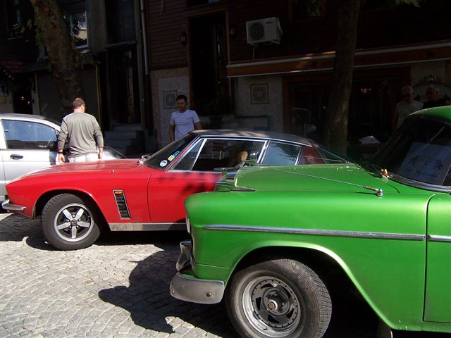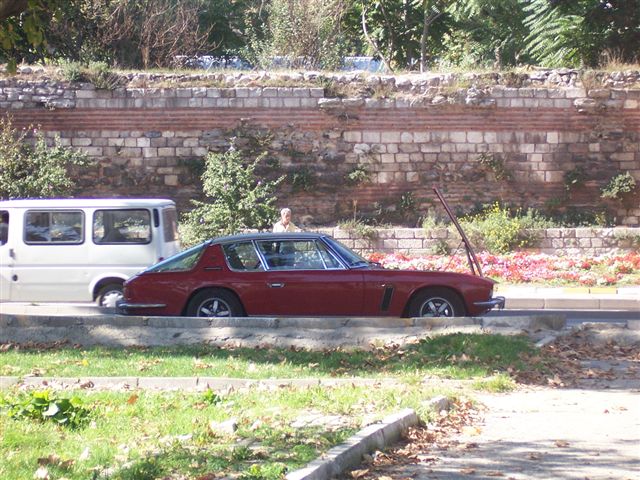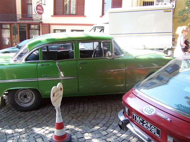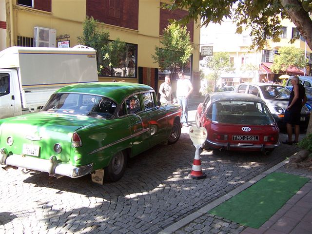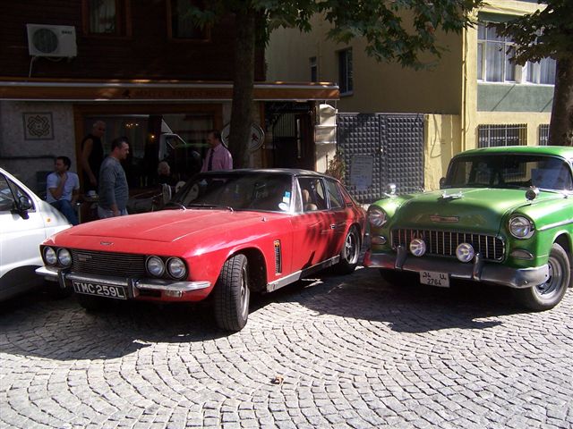 Top Touring Tip 4A: Don't go to a Turkish Barber Just After Falling out of the Pub... Refreshed after a car free day, and with only the worry of having to think of excuses to tell 'er indoors about the carpets, we decided that 1 Jensen free day was enough, and so we would have a tour of Istanbul and retrace our steps in the daylight. A quick peek over our balcony revealed the car was still there, and gave us chance to admire the view. Since we had taken delivery of the new air conditioning drive belt we had hummed and ahhed about fitting it, but we reasoned we had done about 700 miles with one belt, so unless it became a problem we would stick with just the one. It was a savagely hot day, and this would prove be a good test of the new Sandon air con compressor and the cars cooling systems as most of it would be in congested traffic. Part of the reason for the choice of our hotel was the fact the owner had a 1950's Chevy Bel Air, which he would collect you from the airport in if you booked at his hotel. It seemed like a good photo call for the 2 cars. The owner was more of an admirer than an enthusiast, and all technical enquiries were met with a smile and a shrug of the shoulders. He didn't even know the size of the engine, but thought it was a straight six. This looked right as peering underneath there was only one exhaust pipe, which then split into two tailpipes. So we headed out from our area of Istanbul which was called Sultanahmet, and was referred to as "the old town". As we drove around we passed yet more fabulous monuments. And was made to feel welcome once again! We had been experiencing an annoying whine affecting the stereo (we checked the rear seats, but the women were at home, so it wasn't the usual cause!), and so we pulled over to try to move various cable to see if it was noise from the alternator. After a cooling down period, it was safe to try to look inside!