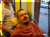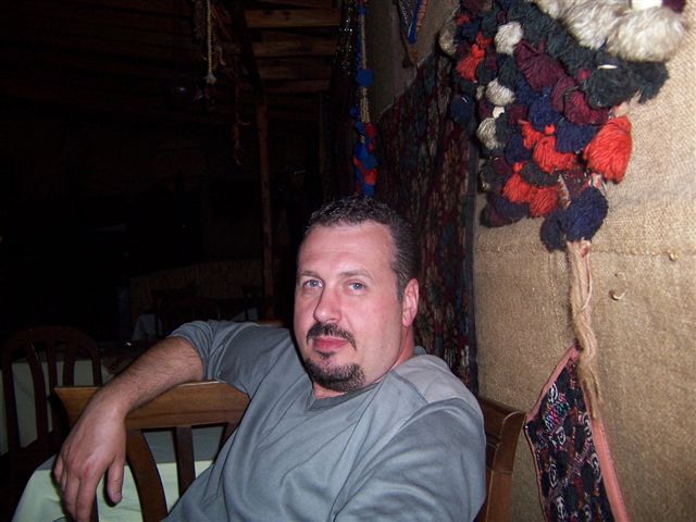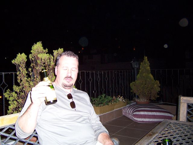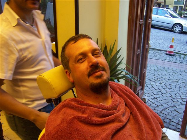 were you lost or sightseeing?" The air con was working very hard keeping the temperatures down in the car, and as we were stuck in traffic with no air coming in the radiator, the temperature gauge started to climb and hovered just under the red. It had been like this in other traffic jams on the way and we now had the confidence in the car just to ignore it as we knew it wasn't a problem. Where there is a will, there is free enterprise, and this chap was making a living out of the traffic jams! We had to have our wits about us though as the driving standards were "interesting" to say the least. We eventually headed over the bridge and back into Asia. Excitement of leaving one continent for another got the better of us again, and we forgot to take a picture of the "Welcome to Asia" sign on the way over, so we had to try get the bugger on the way back! I mentioned the quality of the driving, but some of it had to be seen to be believed. We skirted the harbour, and saw docked the biggest ship we had ever seen. This was a ferry and cruise liner that toured the Black Sea, and dropped off at Odessa. We had desperately want to go to Odessa, but there was no direct road from Istanbul, and the indirect route would have taken days. The other way was this ferry, but it was a 26 hour crossing, and Chris gets sea sick just looking at pictures of boats. We headed back into the old town And stopped at brothers for a well earned beer. All the local traders came to see the car, and were sufficiently impressed to make cash offers to buy it. I could see Chris waverering and doing mental Euros to Pounds, minus 2 first class flights to Blighty, type calculations. This became a feature of the trip with the car getting lots of very enthusiastic attention. People either remembered them and were astonished to see one so far from home, or had never seen one before, but were amazed by the styling and quality. After a few beers, I mentioned to Brother that I always wanted to go for a proper shave, the one with a cut throat razor, and all shaving oil, and stuff. He said he was going to his mates place down the road to get his hair done and we could come with him if we liked? Sounded like a plan to us, so we had a few more beers and waited for Brothers break. I'm not sure if it was Dutch courage or what, but we ran down the road to the barbers still clutching our pint beer mugs. A German woman shouted "Bloody English" at us as we ran past. So much for pretending to be Scottish... I had a fantastic shave, just like I had always wanted since being a kid. It was about now that things for me started to go a little strange. I had noticed that I had not really seen many men with grey hair, and had naively thought it was because they all had jet black hair. Not so, they all routinely have it dyed black. They asked me if I would like mine done, and like a fool I said yes. Well, when in Istanbul... Chris hade more sense and just had his beard done. He even had a manicure while he was waiting! We got back in the pub to comments of "weren't your older brothers in here earlier?" Yeah, right! This hair dye was really black, I mean it made entire rooms darker when I walked in. There are black holes in space that aren't this black! Chris sporting his new Genghis Khan look! It was at this stage we spotted the hierarchy involved in Turkish bars. Brother was the senior waiter, so he would sit with us having a drink and keeping us entertained. If we wanted to order he would shout "Mehmet!", and poor old Mehmet would have to come running from out of the back of the bar, take the order, fetch it, bring it back, then hand it to Brother to pass to us. We decided that this was a fantastic system and tried to work out how to break the news to Steve Payne that he was going to be our Mehmet when we got back... It turned out he became Mehmet before we got back, but more of this later. The night went well, and considering we had only popped in for " a sharp one", the bill came to 200 Euros! We headed back to the hotel and drank champagne on the hotel roof bar. I have this one Chris's authority as I have no recollection at all... Chris sporting his totally spannered look! I have no idea what time we went to bed, but I only know the horrors I faced the next day... Day 6: Och, Ma Heed!