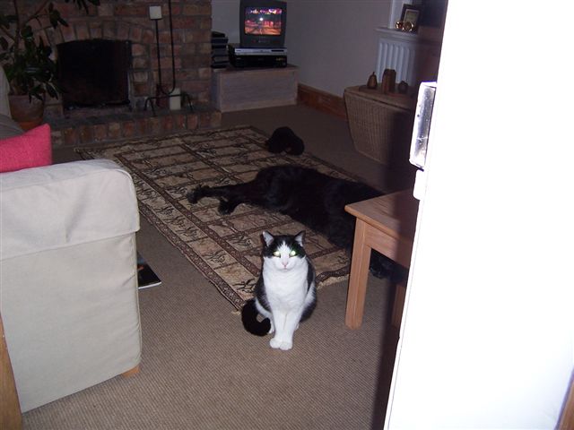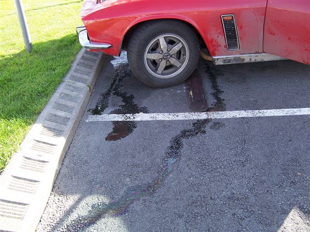 We were soon back into France and picked up the signs for "Tunnel Sous La Manche" As if compelling us to stop, the speedo gave up the ghost. Should we check into a hotel, order a new speedo, on a VERY slow delivery, and have a few more days.... It turned out to be the drive cable, so it would have been a very long wait! When we arrived at the tunnel there was a train due almost immediately, so we just had time to get some duty free shopping in. When we came back we found this. It turned out to be a split radiator, but we didn't even bother opening the bonnet as we knew the old girl wouldn't let us down, and she didn't, and we soon saw the signs for Blighty. Other than being back on the right side of the road (the left side!) the journey home was uneventful. We stopped for fuel and saw that water was running out of the front of the car, but we were international, transcontinental, drifters, and a puddle of water was nothing to us, so on we went regardless. Chris dropped me home to my place in the sticks in Worcestershire. Chris had said he was never going to clean the car again, the grime, and dirt being a medal for service up and above the call of duty, but she was absolutely leaping! The interior was not much better, with bags of dirty washing getting very ripe in the heat! I put down my hand woven, silk on silk carpet in the front room, and when I came back I found Boo the dog and Mulder the cat enjoying it. *** Euros for them pair to lounge around on! Chris made the 45 minute journey back to his house, and 136-8801, after 5000 plus miles, 14 countries, and 1 gearbox, was back home! P.S Chris didn't keep to his word about not cleaning the car. I went round a few days later to pick up some stuff and it was all shiny again!