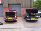 In Typical British weather fashion it had been the best April weather in living memory the week before the technical day, with temperatures of 21c against the seasonal norm of 11c. And the day after the technical event was also meant to be beautiful, but the day itself was meant to be a shocker, and so it proved as I was driving to Chris Miller's house. I called Steve Payne who had already arrived at the event at this stage, and he said the weather was fine, so it was fingers crossed... I picked up Chris and we loaded my car with tools, electrical parts, and anything else we thought may be useful. Our journey there was a little eventful as me and Chris were so wrapped up in conversation we got lost, and then when Chris got on the map he thought the event was at Martin Robey's and not Appleyard's, which are in 2 different counties! We stopped at a cafe and got some sausage and egg butties and coffee to take to Appleyard's Sadly for Chris, there was an enormous pothole just before we got to site, and he spilled boiling coffee on his Niagara's* Chris, with Steve Payne and Steve's son Tommy, eating a sausage butty to take his mind of his scalded Jacob's* The car park was already filling up with cars The idea of the day is to tackle jobs that the owners are not confident that they can do, or to use the knowledge available to solve problems that have been difficult to pin down, so a range of jobs were going on. I apologise in advance if any of the cars, names or combinations are wrong, as there were a lot of people I had not met before, and I gave the task of getting names and registration numbers to Steve's son Tommy, so please forgive me if there are any errors. Kevin Ainsworth was rebuilding all his brake callipers and master cylinder with new seals, and making use of the 4 post lift in the workshop Gill Wild and Neil Willmott had a current drain on their CV8 which kept flattening the battery, so I helped to track down the problem Pete Tules and Brendan Mutagh seemed to spend most of their time find the best place to add the chassis plate! Lee Marshall rewiring his CV8 rear number plate light We had a visitor all the way from Australia in the form of professional car restorer Dudley Proudfoot who had brought with him an Aussie classic car mag that featured the his Interceptor which had had recently restored Dudley getting to know some of the "Pommy Bastard's" Other than a couple of brief showers which caused everyone to run into the garage, the weather held out and the work carried on. Mark "Pie Man" Maniatt arrived for some headlight wiring in his super smart MK3 Both Mark and Pete Tules cars were wearing the Cropredy Bridge 17inch wheels Pete's were early versions of the wheels, and he mentioned they have suffered some quality issues and tarnished badly. Martin Ritchie had decided to refurbish his brake peddle box and brake servo Off the car, and being cleaned with some advise from Kevin, the fulltime mechanic at Appleyard's Andy Brookes the owner of Appleyard's (on the left), meets and greets some of the visitors Steve Payne is going to the Belgian Jensen owners event in Ypres next month, so he asked Chris Miller to give his engine bay wiring an inspection to make sure it was all going to be reliable. Chris found all sorts of potential wiring problems due to old wires and years of engine bay heat. Replacement wire have heat shrink sleeving added Paul Strange was bringing his MK2 FF for reasons other than a failed starter motor, but fate thought differently... Dave Newby's FF was used to tow the stricken car to Appleyard's Paul's car arrives on the end of a tow rope. We admired his multi point injection... While Dave Newby got to work replacing the starter motor. Lunch arrived, so we downed tools for a while I took the time to admire Keith Lee's beautiful 541 Kevin Ainsworth's brakes had gone well and had reached the stage where they needed bleeding, so Kevin the mechanic wheeled out his handy dandy automatic reservoir topping up gizmo The only sad part of the of the day was Paul Strange's FF had to go home on a trailer as his new fuel injection pump was pulling very high current (it was only completed yesterday), and so it was thought safer to take it home on a trailer. All in all an excellent day, with lot's done, new skills learned, and new people met. A big thanks to Andy Brookes of Appleyard's for hosting the day, his wife Christine for the lunch she put on, "Super Kev" the resident mechanic, the weather for being fairly kind to us, and to everyone who came along.