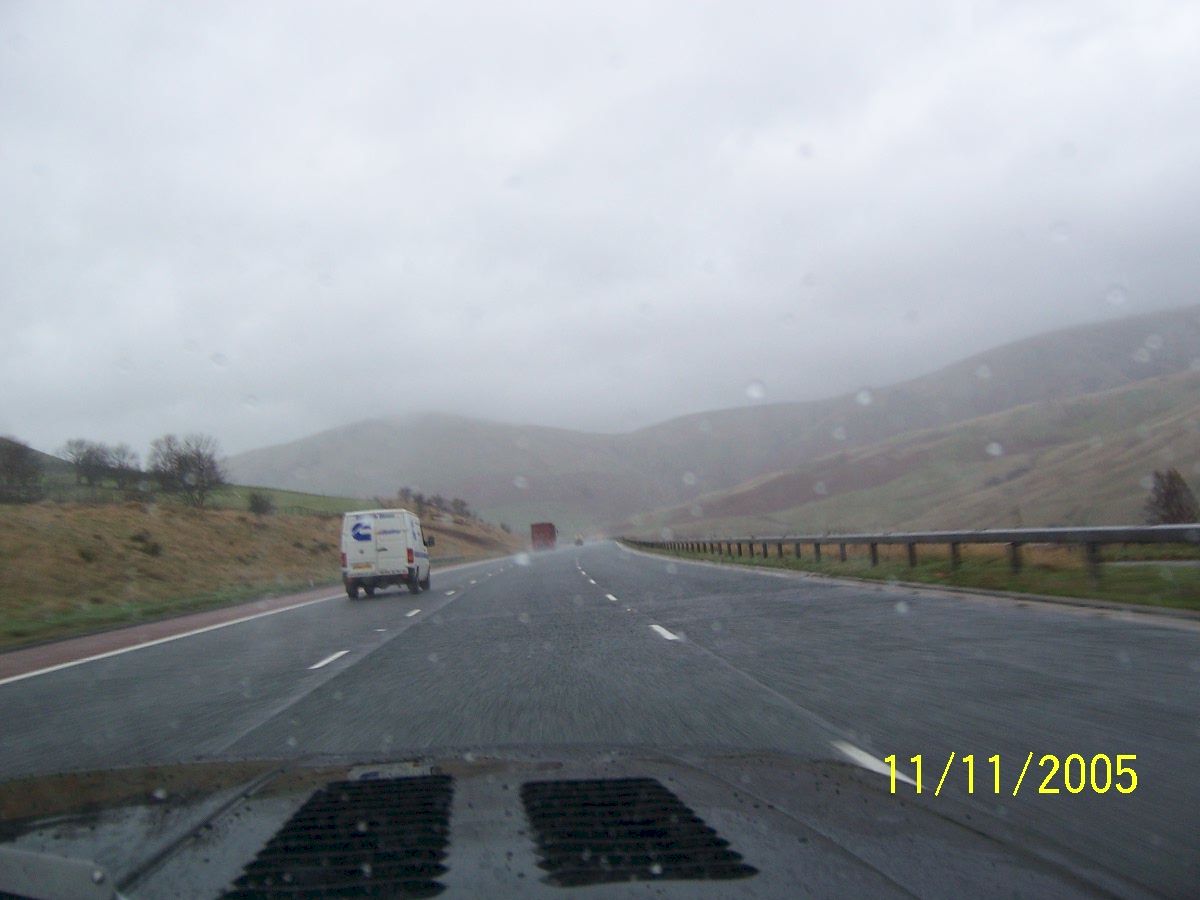 Monday Steve left at 5am in the morning to avoid the traffic and cruise as gently as possible to nurse a bone dry diff. We had decided that I would follow Chris, and if we had to take off the drive belts, I could top his battery up occasionally with jump leads. Phone calls to Steve during the morning saw him making good progress, and no problems with the car. Chris and I dawdled along at 60mph until we reached the Lake District, when we threw caution to the wind and cruised at 80mph to get home in a reasonable time. We made it back with no problems other than the spindle of the windscreen wiper mechanism stripped all the spines off on the drivers side wiper on 136-8779, so the rest of the 300 miles was made with no wipers! Leaving Dunkeld on Monday morning. Tuesday