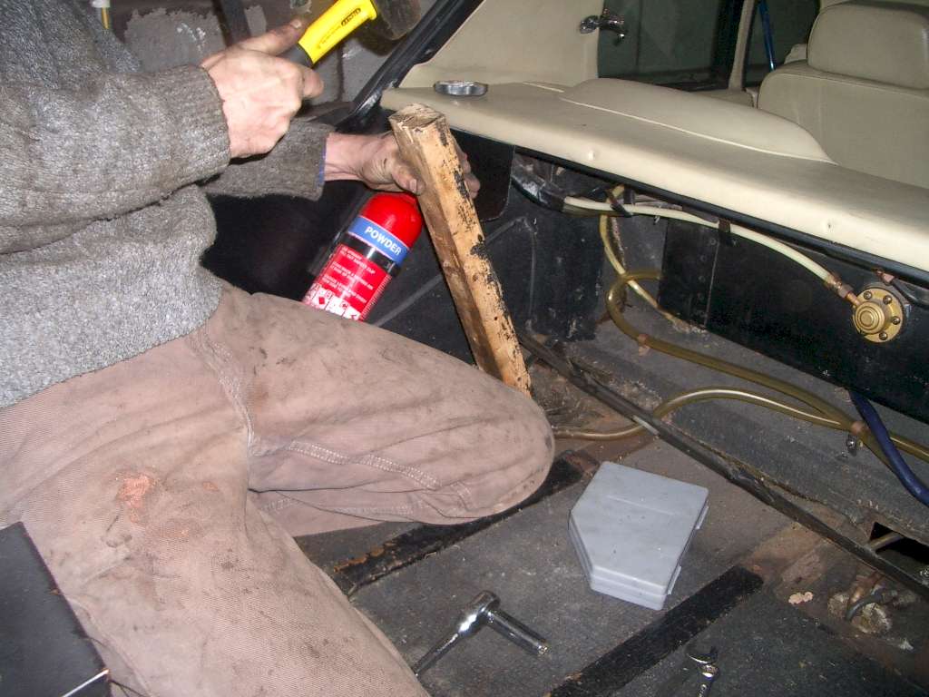 Next: undo the fuel filler hose, there will be a jubilee clip (or similar) holding this - one at the fuel filler bowl end and one direct onto the neck of the tank. We couldn't get the tank-end one off in-situ so just undid the bowl end clip. It is possible to remove the tank only having removed the clip from one end but its easier if you can get both off. This is an ideal time to replace the filler hose anyway as they do tend to collapse internally even if they look ok from the outside. If you're having trouble filling the tank at the pumps then this could be the cause. To get to the filler hose you need to remove a small splash panel in the rear wheel arch which is held in place with two self-tapping bolts. Then: undo all the tank strap bolts. The top ones may need a bit of gentle persuasion once undone before they'll let go - see below: If you're replacing the straps anyway and can't undo the bolts (at either end) you can just cut through the straps and/or bolts and bend them out of the way. Put something under the tank so that it doesn't fall when you remove the last strap. The tank isn't very heavy (when empty !) so just a footstool or similar will do. The tank can then be lowered down and slid out from under the car, see below, this is where you'll need two people. After that, the tank was flushed through with the drain plug removed to get rid of any big bits of debris and given a coat of paint. The replacement is the reversal (hah!) of the removal. You definitely need at least two people, three is ideal. Here's what you need to do: