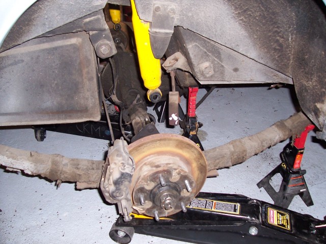 Once the Panhard rod and both shocks are disconnected, you can lower the floor jack that 's holding up the diff. DON'T FORGET THIS STEP, IT'S VERY, VERY IMPORTANT. OTHERWISE THE SPRINGS WILL BE UNDER HIGH TENSION!!!!!! Once lowered, you'll see how low the springs hang when they are not being supported by anything.