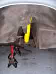But first, we need to get the car off it's wheels in order to access a lot of this. While the car is on the ground, loosen the wheel nuts. Jack the car up and support it with four jack stands. Place these under the frame tubes, as far forward and back as possible. Make sure you are on level ground when you do this and check the car (by attempting to rock it) before you remove the wheels. Make sure you have at least a foot of clearance between the lowest part of car rear of the axle.