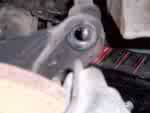 In order to disconnect the rear shocks, you'll have to compress the rear suspension a bit. To do this, put a floor jack under the diff and lift it a bit. The trick here is not to lift too much as you will start lifting the car off the jack stands (which you did put under the frame rails, didn't you?). Lifting the rear suspension about 2 inches seems to do it. Once the tension is off the shocks, you can unbolt and remove the lower nuts (the bolt is welded to the axle carrier). It's a little awkward as they face the centre of the car, but I used a 3/8" impact wrench and they came off easily. If you don't have an impact wrench, you should use a socket. A long extension, along with approaching the nut from the opposite side (e.g.. come in from the passenger side to do the driver's side nut) may make it easier to get leverage. I used this strategy successfully to undo transmission bolts on an RX7 from the rear of the car (with a 6 ft extension !!!). In any case, once the nut is removed, bag and tag it and the associated washer, you can then push the shock off the mounting pin. Do the same for the other side. You'll also need to disconnect the Panhard rod. You can see it to the right of the shock in the above picture. Don't bother pulling it out, you don't need to. Make sure you bag and tag the nut and washer for the Panhard rod.