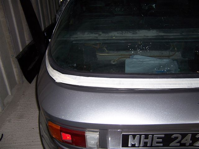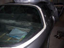 Doh! The other side masked off ready for fitting Trim getting a coat of mastic on the back And fitted to the car Right. I don't know why, but I had been putting off the trim around the rear window like a visit to the dentist for root canal work. Don't know why, but it was giving me the ebie jeebies. Any way, it needed doing so as usual lots of masking tape to start with. A lot of the original holes had been lost during the repairs, but luckily some had survived to give me a start. If your having your hatch repaired, then ask the body shop to leave a couple of holes to get you started. It was then a case of drilling from inside the boot outwards, taking care to align the drill so it didn't go off at odd angles. First section fitted And the top section in place I found I needed to fit some new holding pieces as the threads had broken off the original ones.