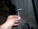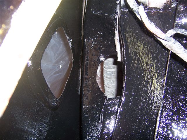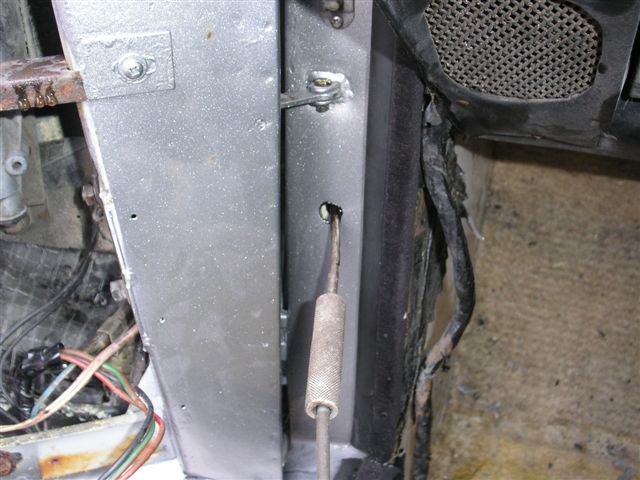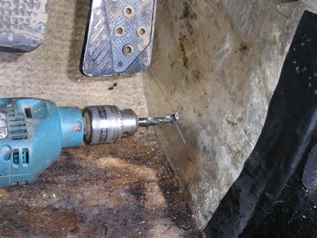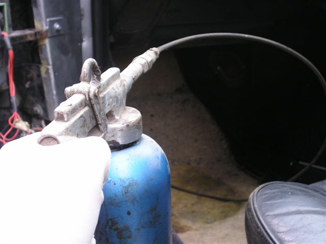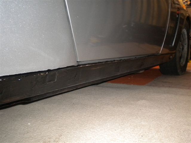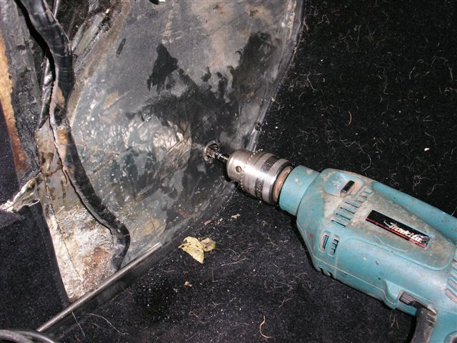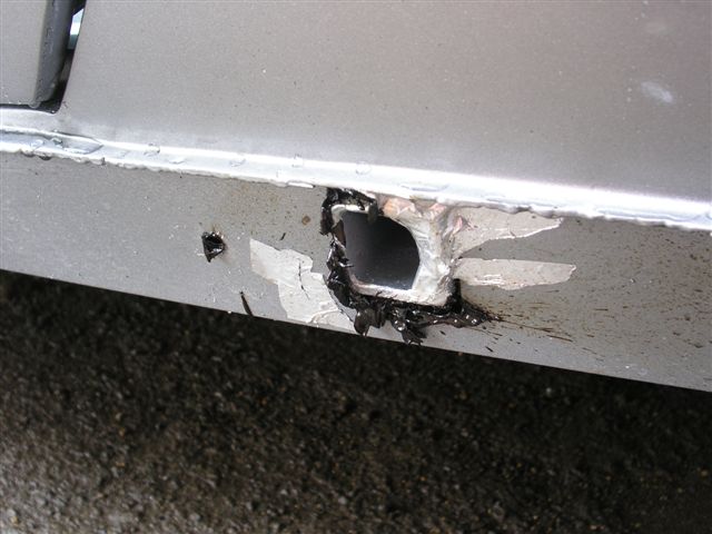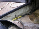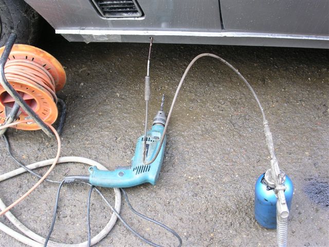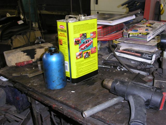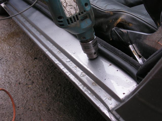 March 2010 Update Due to the bad weather, and other factors it has taken until March 2010 to get the car back to paint the fuel filler cap and get the corrosion protection done. The corrosion protection involved drilling holes in the sills to get the Waxoil cavity wax in. Waxoil is very thick when cold, so we used a heat gun to warm it up and make it runny enough to inject. It's horrible stuff and the body shop lend me a breathing mask as the fumes are quite potent. The sills are in 3 sections, so this involves drilling 3 holes in the sills.