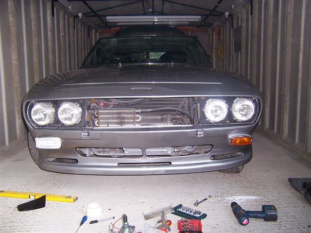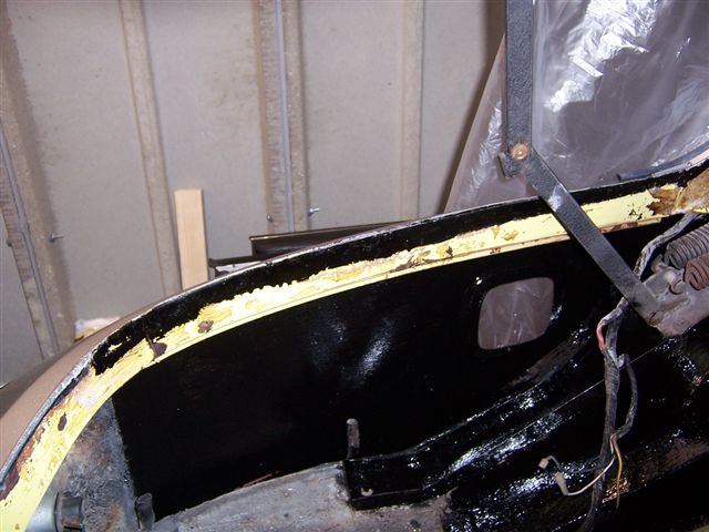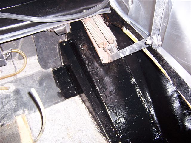 And dripping out from underneath. As I am getting on a bit, and am too old for lying on cold concrete, I had fitted underlay and carpet in the garage. So I put some plastic down to catch the drips! The outer sills then got a couple of coats of underseal It was now time to refit the refurbished headlight surrounds and front grille. And new door mirror