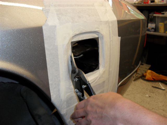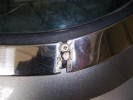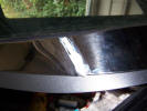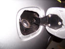 It had reached the stage where I needed a helping hand, so Chris Miller came over to assist on the 2 man jobs. The first was refitting the fuel filler bowl, which needs one of you to hold in place, and one to drill the holes. Top Bodywork Tip If you have a new rear wing fitted FIT THE BOWL BEFORE PAINTING THE CAR! The first problem was the hole in the panel was 10mm (3/8") too small and needed to be cut to size. This involved cutting with tin snips, the filing to finish to the correct shape. This meant trial fitting the bowl a lot of times to make sure the hinge would open, and the lid was in the right place. The car has got to go back to the body shop for the painting of the coach line and cavity wax injection, so I will get them to paint the areas where the metal has been cut out. Once this was done, we added some silicon sealant to stop fumes and water getting into the car. We used 2 self tapping screws to secure the bowl in place BEFORE riveting as it is easier to take a screw out than a rivet if you need to make adjustments. Once we were happy with it's fit we then drilled and pop riveted the bowl in place.