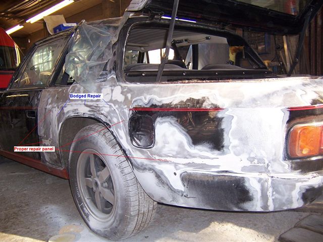Not only has he done this, but the lunatic is going to do the same to the other side!!!!! I rang Tim to see how the work was coming on, and to my surprise he said the new panel was fitted, and was asking about shut line gaps, etc. My sources had told me a MK3 that had come 3rd in Gold class concours was visiting near the body shop by coincidence, so I popped around to the shop to see my car and to pick up Tim so he could photograph the concours car to see the shut lines and panel gaps so he knew what to aim for. TOP BODY WORK TIP. If you have a new rear wing fitted FIT THE BOWL BEFORE PAINTING THE CAR! The hole in the new panel turned out to be 10mm (3/8") SMALLER than it needs to be.
