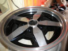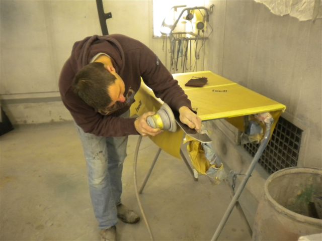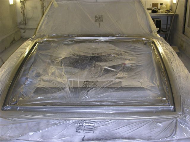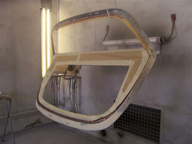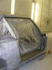 I had asked the body shop to paint my newly polished wheels and front grille. I had tried to paint the grille myself, and has encountered blistering of the paint no matter what I tired. Speaking to other Jensen owners who had tried to paint their grilles, they had experienced the same problem, so whatever Jensen had painted them with was pretty unpleasant. Simon the paint sprayer finishing off the grille in the paint booth. The body shop experienced the same problems with the wheels, and eventually we had to use black tinted primer and a gloss lacquer as they were the only things which would not react. I had scratched the drivers door during the refit, and had to cut the hole for the fuel filler bowl, so Simon painted those for me as well while it was back in the shop.