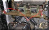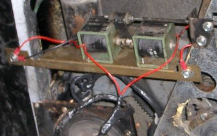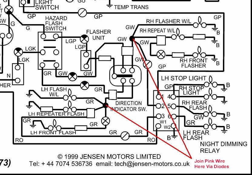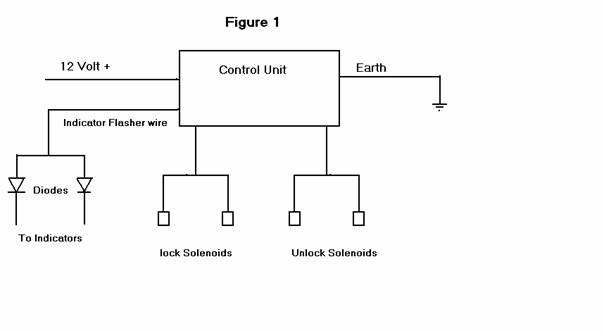 Picture 1: RHD Passenger Door Solenoids Transferred from Their Original Bracket (bottom) Onto a LHD Passenger Door Bracket (top). Once the unit is mounted, the bracket can be fixed. On my car, there were already holes for the bracket drilled in the doorframe, it was just a matter of drilling them out to suit the size of fixings to be used (dont use fixings with to large a head, as you wont be able to get the door card back on if they stick out to much). Once fixed, the rod from the solenoids can be attached to the door locking rod, ensuring this can slide side-to-side smoothly. WiringAfter fixing the control unit, and the solenoid brackets, the wiring can commence. The Interceptor wiring diagram is available form the Jensen Owners Club web site https://joc.org.uk/product-category/books-wire-diagrams/ and is essential at this point. There are 3 wires on the back of the door-locking switch. The brown wire is a permanent 12-volt live feed, which we will use to power the control unit. The other 2 wires are the solenoid wires for the passenger door. One is brown with a red stripe, which is the wire to the locking solenoid, and the other a brown with a green stripe, which is the wire unlocking solenoid. Picture 2: New RHD drivers solenoids connected to the existing wiring leading to the RHD passengers door solenoids and remote control unit. These wires need to be connected to your new lock and unlock solenoids, so both doors work in unison. The control unit and the passenger and drivers door solenoids now need to be connected up as per the wiring diagram in the control units instruction book marked Positive Pulse System (See Figure 1) A final touch is to connect the pink wire from the control unit to the indicator wiring, to flash the indicators simultaneously to show the unit has activated. The wiring for the indictors can be found by the ignition switch, and should be connected via the diodes to the pink wire (you will need 2 IN5400 diodes, Maplin Part No QL81C). The diodes will prevent the indicators flashing simultaneously during normal operation. All that is left to do now is to check the operation of the system, and adjust the new solenoids and rods to allow smooth operation of the door lock. As long as you have made sure that your connections are correct, and you have the correct brackets before you start, the job can be done in about 2 hours. Worried about reliability? Steve Payne has had this system on his car for 18 months, with faultless reliability. 21st century electronics on an Interceptor. Whatever next? Well, you can get optional extras for this central locking control unit, which includes a connection to close your electric windows when you lock the doors. Watch this space