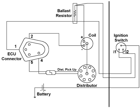 The other important component of the electronic ignition system is the ballast resistor. It should be checked with an ohm meter and should have 1.2 ohms of resistance. Typically, a failure of the ballast resistor will result in the engine starting, but then dying as soon as the key is released from the start position. It is often handy to have a spare ballast resistor or ECU lying around to use for troubleshooting. Upgrading or replacing an existing systemWhen replacing a points type system, you will need the wiring harness that goes with the electronic control unit. The installation is fairly simple and the only electrical connection that needs to be made is to the ignition "+" circuit. If you are replacing an Electronic Lean Burn or Electronic Spark Control system, there are several other things to be considered. While these systems are of themselves, electronic ignition, they do not use the same components as the regular electronic ignition system. The spark advance was being generated by the computer, therefore the distributors lack vacuum and mechanical advance. Many of these distributors also have two pick-up coils and are not usable with a regular electronic ignition system. Additionally, the carburettors that were equipped on these cars may lack a vacuum advance port for a conventional distributor and often need to be re-calibrated for use without the computer.