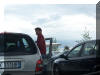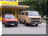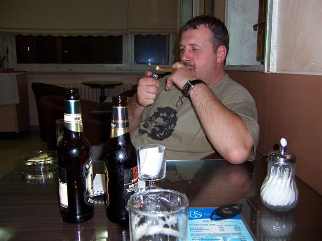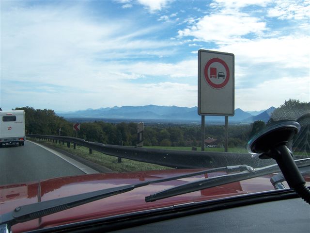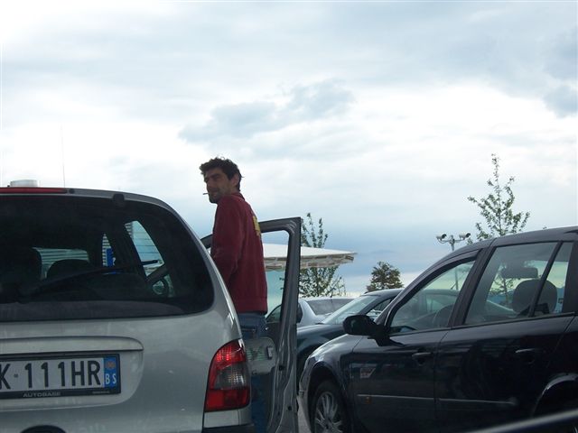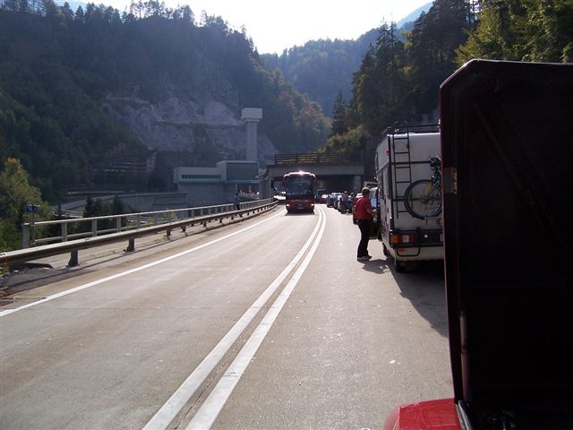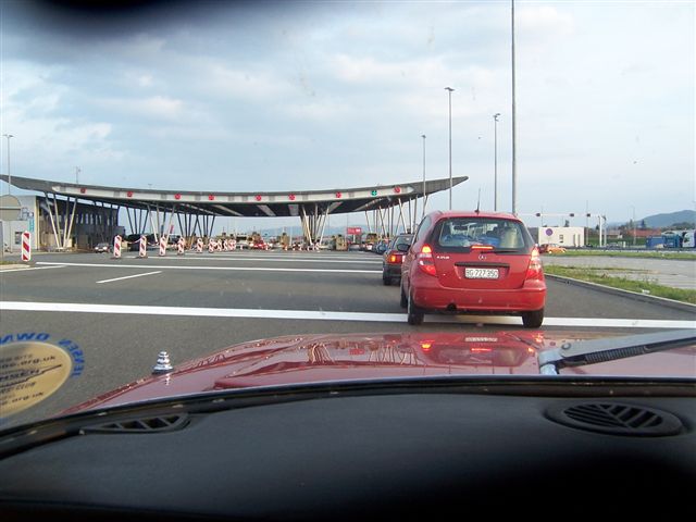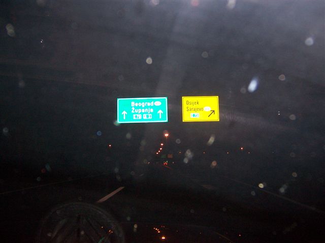 Top Touring Tip 2: Don't sit on someone else's wad. Our early morning ritual, along with oil/water checks and re-stocking the victuals bag, was to check the tyre pressures. We knew the satnav wouldn't be much use in Eastern Europe but when we set it for Belgrade in Serbia it just said "Your destination is in a restricted area" it may have well said "there be dragons" for all the use it was going to be today ! However we did use it each day to record our longitude-latitude so we'd have some location info to send home and also to the British Steel mailing list. Today's journey from Ulm, Germany to Belgrade, Serbia was the longest single leg of the whole trip. About 680 miles, crossing four national borders. We didn't expect much hassle crossing from Germany into Austria but didn't know what to expect about the rest of the route which would take us through Ljubljana in Slovenia, then Zagreb in Croatia and finally into Serbia. As we were cruising quite nicely (we aimed to stay at 3,400rpm which was more or more around the motorway speed limits of most European countries (130kph/83mph) I decided to do some in-flight adjustments to the mapped ignition timing; we settled for 58deg advance at cruise which seemed to suit the car well - especially on German 100 octane fuel... That was Germany then, gone in a flash, and now it's all looking a bit alpine - must be close to Austria then, that's Vignette country. Click here for a video of the car in the Alps Unquotable quote: "What's the German for plastic bag?" (read the article of a plastic bad taking out Steve Payne's rear axle in Scotand) We stopped at the last petrol station before the Austrian border - along with about a million other people - I guess the fuel in Austria is either expensive or crap (or maybe both, we never got to find out as we passed through without stopping). We were blocked in at the pumps which was a bit scary as this twat from Italy was smoking whilst filling up his car with petrol ! Having filled the car it was time to stock up the victuals, here's Kerry with the grin of a man having consumed four mars bars. You'll also see our box of home-made cake, courtesy of my wife Elspeth (more on that later...). So with car and drivers refreshed we hit the road again. Spotted this sign, which was nice: We thought it meant no lorries in the outside lane (cool !) but apparently it means only red lorries are allowed in the outside line - plus anyone in a hurry and anyone with one of those cute Vignette stickers, best 10 Euros we ever spent - ye-ha ! Whilst researching our route (ok, ok, so we glanced at a very old map, went down the pub and declared it sorted) we found this: Karawankentunnel it seemed like a good idea at the time 'cos it saved driving over the mountains... What our in-depth research failed to uncover was that for 364 days a year it's actually only one lane wide (the other 1 day it's shut) with a one-way stop-go queue at either end, starting in Belgium and ending in Japan ! Here's a picture of the queue after we'd sat for about an hour: We thought, naively, that it wouldn't be too much longer as there was a coach coming through from the other side - turned out it was running out of diesel and had turned around in the queue and was heading back home. We finally realised we were in for a bit of a wait when the family in front invited us to their roadside BBQ ! Anyway, we finally got to the front of the queue: Actually it was quite impressive, 7.863 km of pristine tunnel and then one slightly worn sign being attended to by about ten earnest workers with clip-boards - well worth the wait then - I'd have hated to drive through a tunnel with worn signage.. Unquotable quote: "It's a conflux of countries" So, this was it then, the Austrian/Slovenia boarder - we're leaving safe old "Euro Zone" for uncharted waters - we'd never been this far from home by car before, and it turns out to be... well, what a welcoming place although the eagle-eyed amongst you will have spotted the traffic cones (our unwelcome friends for the next 48 hours - more on that later) - and the eagle, eagle eyed will have spotted the reflection of Kerry in the windscreen shouting "Watch out for the cones" - a portent of things to come on the Eastern European "motorways". As it turned out Slovenia passed without any fuss - more like northern Italy than Eastern Europe, Ljubljana is the capital: disappointingly civilised - they even have cycle lanes: We had planned to see Ljubljana - there's a "Green Dragon Bridge" that's apparently worth a mooch but having lost so much time admiring Austrian tunnels we decided to press on to Zagreb in Croatia - just a simple border to negotiate first. So here we were, rocking along nicely, good weather and a nice straight road - we'd even cracked open the box of Elspeth's tasty cakes as we came up to the boarder.