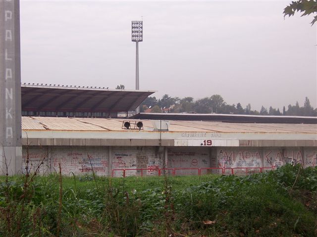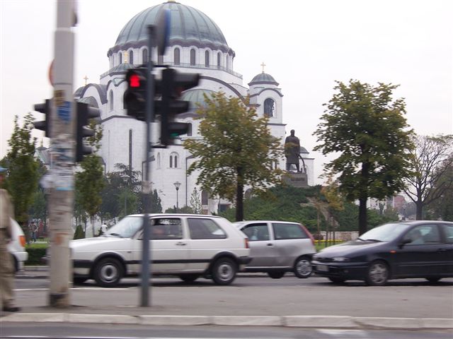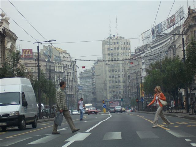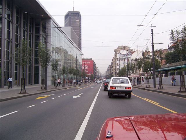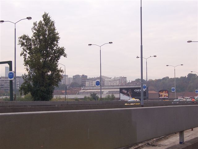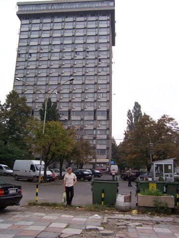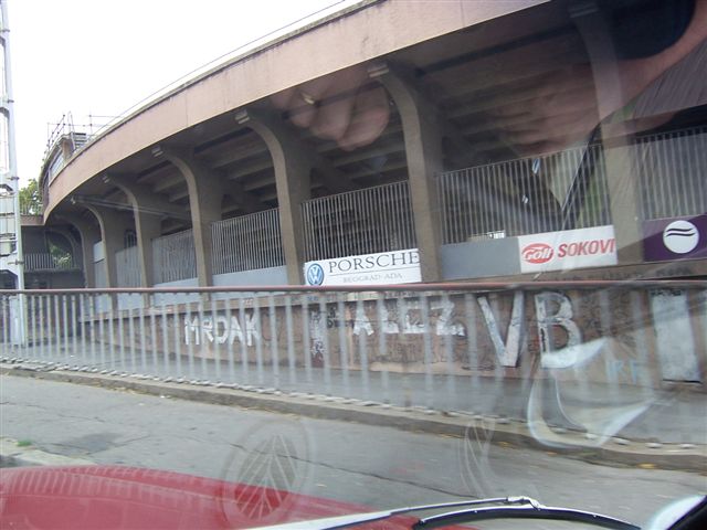We decided to just stay on the main road (E70) and skirt around Zagreb as time was getting on and we had to cross all of Croatia and about a third of Serbia before getting to our scheduled overnight stop in the capital Belgrade. As soon as we'd passed by Zagreb we started to see signs for Belgrade, which was good as this was about half way through today's 680 miles. And then this happened: One of the twin belts that drives the A/C and alternator decided it had just had enough and jumped off the front pulley. Luckily it didn't actually snap and it didn't take out anything vital on its way. As we had two spares and as the engine was too hot anyway we decided to cut the old belt off and just continue with one. Although we had two spares with us it was only day two and we didn't know if one belt would be ok so we decided to call up reinforcements. We 'phoned Steve back in Blighty to check he had spares in stock and he managed to get them boxed up and into the post the following morning - more on those in the following "Istanbul pages". Anyway, it all seamed to be working ok with just one belt even with a full electrical load and the A/C running flat out (the A/C compressor had been upgraded to the Sandon type which puts much less strain on the belts than the older V-twin type). We pressed on into the night and then, suddenly, it was only 100km to Belgrade, we were actually going to make it - and we did ! Finding the hotel in Belgrade was surprisingly easy but as it turned out the fan belt incident did cost us our dinner that night - the restaurant closed at 11pm, about 2 minutes before we arrived, so there was nothing for it but to relax in the bar and light up a fine Cuban. So far a total of 1,619 miles (2,605 km), not bad for two days motoring. Eventually the hotel bar closed so we set off to find our room; this picture doesn't really do justice to the relentless drabness. There were 14 floors of this, plus one for the staff quarters, that didn't have paint on the walls or carpet on the floor so in the end we felt lucky to even have a room. When we finally got to our room - it promptly fell apart, apparently you're not actually meant to open the door, it's just leant there to stop next door's wall falling in. Kerry is in the "fire business" (putting them out not lighting them!) so we had to stop and stare at this. From the state of the cracked hose and from what we could tell from the label it was last serviced in 1973, which had a certain symmetry with some Jensen's. When we first arrived there was a TV show on which seemed to consist entirely of two women sitting down and talking - about four hours later we switched on the TV in the room and they were still going strong - and it seemed to be on every channel - so that was our lasting memory of Belgrade TV. In the morning the hotel looked much better (inside) - you could see it was actually faded grandeur - it had been a senior apparatchik's hang-out in the old (communist) days so was actually quite well decked out - except for the lift system, you could hear the wailing of people stuck on the fourth floor (we had been warned) as we made our way up the stairs to the fourteenth floor breakfast room. I've never had meatloaf for breakfast before but as this was our first proper meal for a while we got stuck in anyway. Actually the fried bacon was absolutely fab and set us up grand for the day ahead. Whilst fettling the car outside the hotel Unquotable Quote: "oh dear - we seemed to have scratched the thin veneer of civilisation" for the day ahead we met a Belgian chap who seemed to be a cross between a businessman, a secret agent and a second-hand car salesman. He wouldn't let us take his 'photo but did dispense some valuable advice for English people travelling abroad - pretend you're Scottish ! Outside the hotel was much commotion, the police were out stopping the traffic - this seems to happen just by blowing a whistle at which point everyone drives for the nearest pavement - just before a convoy of five Hummers (http://www.hummer.com/) came roaring around the corner - driven by plain-clothes types with machine guns hanging out the windows. It was later in the day when we passed a court-hose building surrounded with TV crews covering the trials of ex-leaders from the Balkan conflicts I guess this is when we realised we were actually in central Europe proper. From now on we also started to see quite a lot of classic cars and also classic car bodges, such as the old "screwdriver holding up window trick" We decided to take a turn around down-town Belgrade before leaving for Istanbul No visit to any town would be complete without a tour of the local football teams beaten by the glorious Man United, luckily Belgrade has two "Red Star Belgrade" and "Partisan Belgrade" Here's the Red Star's shop and stadium I was surprised how close the two clubs are together within Belgrade; must be interesting when both are at home, here's the Partizan stadium: There were actually quite a lot of nice buildings in Belgrade, here's one: Time was pressing on so we decided to head out of town - not as easy as we'd thought. Most of the main roads out to the motorway had been dug up but nobody had bothered changing any of the road signs so every road out of town seemed to end up in an abandoned building site. After driving around for a bit (more on that later) we stopped to ask directions and two blokes got into a fight (luckily between themselves) about which knew the best route. Kerry also asked a policeman - I'm not sure what "bugger off" is in Serbian but we got the message and drove for the hills at the start of: Go To Day 3 (Belgrade to Istanbul) - "Jensen 1 - 0 Bulgarian Rozzers"