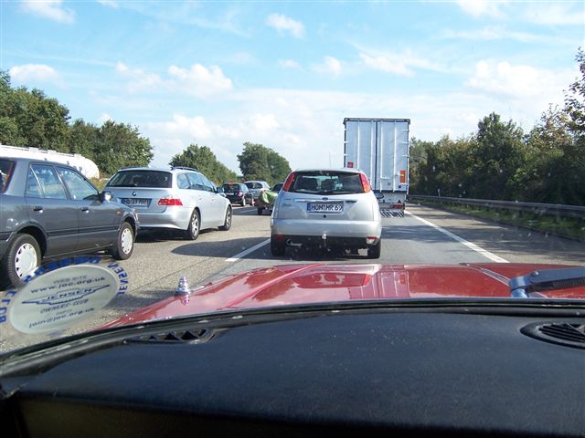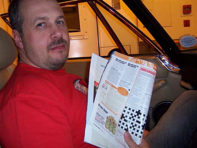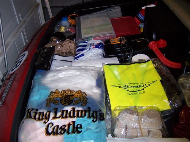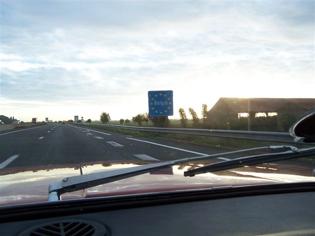 Top Touring Tip 1: Don't sit on your wad. We were going to leave in the early hours of Saturday 30th of September to catch the 5:30am "flight" (as they like to call it) of the Channel Tunnel to Calais, France. So on the Friday evening Kate took me over to Chris's house, and along with Chris and his wife Elspeth, we had a farewell meal. It didn't feel like the last supper, but as we parted Kate broke down in tears at my imminent demise. Good start then. We managed to go to bed at 10pm, with the alarm clock set for 12:30 ready to leave for the Channel Tunnel. Chris had already packed the car, so a quick cup of tea and an e-mail to the Jensen mail list, and we were on our way.