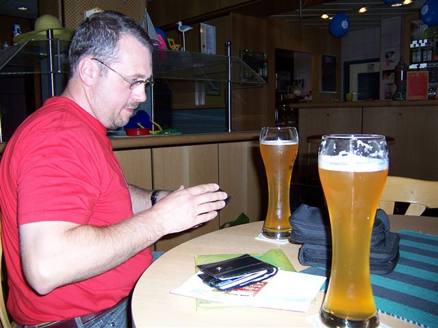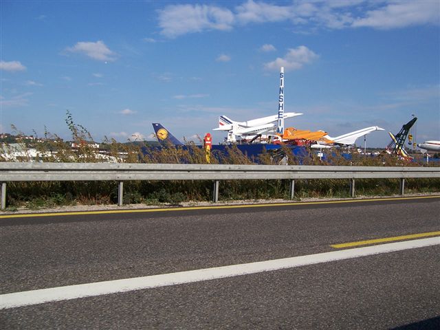 You're not supposed The day was getting hotter and hotter and we hit a traffic jam. With the air conditioning on, the temperature gauge started to rise... No mind, we turned the stereo up louder and took no notice. Chris claimed these birds were buzzards, but they looked like bloody vultures to me! It was a very tight squeeze through the narrow lanes of the road works... and the congestion wasn't helped by people gawping at Concorde, and the Russian version Concorde-ski, side by side at the nearby air museum. This slowed us down a lot, and we got to our first nights destination much later than we had expected, but a pint of ice cold wheat beer soon cheered us up!