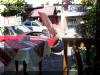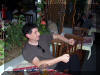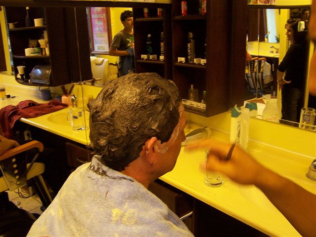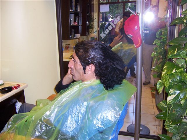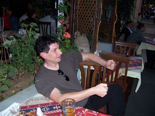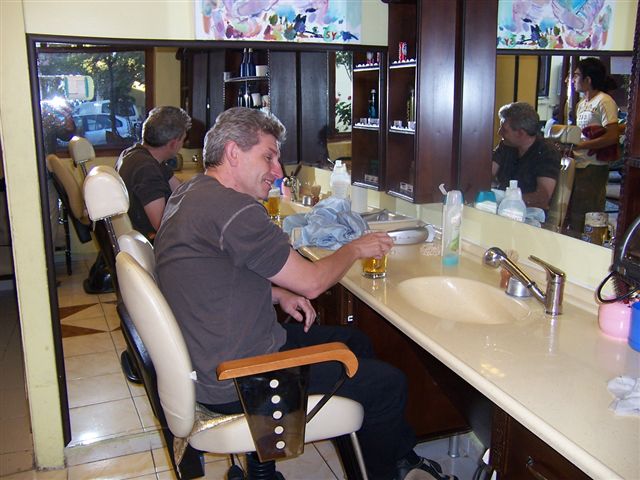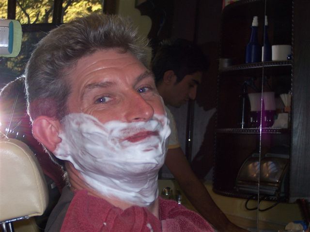 were you lost or sightseeing?" The air con was working very hard keeping the temperatures down in the car, and as we were stuck in traffic with no air coming in the radiator, the temperature gauge started to climb and hovered just under the red. It had been like this in other traffic jams on the way and we now had the confidence in the car just to ignore it as we knew it wasn't a problem. Where there is a will, there is free enterprise, and this chap was making a living out of the traffic jams! We had to have our wits about us though as the driving standards were "interesting" to say the least. We eventually headed over the bridge and back into Asia. Excitement of leaving one continent for another got the better of us again, and we forgot to take a picture of the "Welcome to Asia" sign on the way over, so we had to try get the bugger on the way back! I mentioned the quality of the driving, but some of it had to be seen to be believed. We skirted the harbour, and saw docked the biggest ship we had ever seen. This was a ferry and cruise liner that toured the Black Sea, and dropped off at Odessa. We had desperately want to go to Odessa, but there was no direct road from Istanbul, and the indirect route would have taken days. The other way was this ferry, but it was a 26 hour crossing, and Chris gets sea sick just looking at pictures of boats. We headed back into the old town And stopped at brothers for a well earned beer. All the local traders came to see the car, and were sufficiently impressed to make cash offers to buy it. I could see Chris waverering and doing mental Euros to Pounds, minus 2 first class flights to Blighty, type calculations. This became a feature of the trip with the car getting lots of very enthusiastic attention. People either remembered them and were astonished to see one so far from home, or had never seen one before, but were amazed by the styling and quality. After a few beers, I mentioned to Brother that I always wanted to go for a proper shave, the one with a cut throat razor, and all shaving oil, and stuff. He said he was going to his mates place down the road to get his hair done and we could come with him if we liked? Sounded like a plan to us, so we had a few more beers and waited for Brothers break. I'm not sure if it was Dutch courage or what, but we ran down the road to the barbers still clutching our pint beer mugs. A German woman shouted "Bloody English" at us as we ran past. So much for pretending to be Scottish... I had a fantastic shave, just like I had always wanted since being a kid. It was about now that things for me started to go a little strange. I had noticed that I had not really seen many men with grey hair, and had naively thought it was because they all had jet black hair. Not so, they all routinely have it dyed black. They asked me if I would like mine done, and like a fool I said yes. Well, when in Istanbul... Chris hade more sense and just had his beard done. He even had a manicure while he was waiting! We got back in the pub to comments of "weren't your older brothers in here earlier?" Yeah, right! This hair dye was really black, I mean it made entire rooms darker when I walked in. There are black holes in space that aren't this black! Chris sporting his new Genghis Khan look! It was at this stage we spotted the hierarchy involved in Turkish bars. Brother was the senior waiter, so he would sit with us having a drink and keeping us entertained. If we wanted to order he would shout "Mehmet!", and poor old Mehmet would have to come running from out of the back of the bar, take the order, fetch it, bring it back, then hand it to Brother to pass to us. We decided that this was a fantastic system and tried to work out how to break the news to Steve Payne that he was going to be our Mehmet when we got back... It turned out he became Mehmet before we got back, but more of this later. The night went well, and considering we had only popped in for " a sharp one", the bill came to 200 Euros! We headed back to the hotel and drank champagne on the hotel roof bar. I have this one Chris's authority as I have no recollection at all... Chris sporting his totally spannered look! I have no idea what time we went to bed, but I only know the horrors I faced the next day... Day 6: Och, Ma Heed!