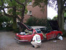 We were soon back into France and picked up the signs for "Tunnel Sous La Manche" As if compelling us to stop, the speedo gave up the ghost. Should we check into a hotel, order a new speedo, on a VERY slow delivery, and have a few more days.... It turned out to be the drive cable, so it would have been a very long wait! When we arrived at the tunnel there was a train due almost immediately, so we just had time to get some duty free shopping in. When we came back we found this. It turned out to be a split radiator, but we didn't even bother opening the bonnet as we knew the old girl wouldn't let us down, and she didn't, and we soon saw the signs for Blighty. Other than being back on the right side of the road (the left side!) the journey home was uneventful. We stopped for fuel and saw that water was running out of the front of the car, but we were international, transcontinental, drifters, and a puddle of water was nothing to us, so on we went regardless. Chris dropped me home to my place in the sticks in Worcestershire. Chris had said he was never going to clean the car again, the grime, and dirt being a medal for service up and above the call of duty, but she was absolutely leaping! The interior was not much better, with bags of dirty washing getting very ripe in the heat! I put down my hand woven, silk on silk carpet in the front room, and when I came back I found Boo the dog and Mulder the cat enjoying it. *** Euros for them pair to lounge around on! Chris made the 45 minute journey back to his house, and 136-8801, after 5000 plus miles, 14 countries, and 1 gearbox, was back home! P.S Chris didn't keep to his word about not cleaning the car. I went round a few days later to pick up some stuff and it was all shiny again!