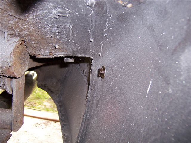 The rear bumper was a little more difficult as there were no holes in the new rear wings for the bumper end bolts, and the inner rear wheel arches had been replaced, so there was no holes in the inner skins either. This was a real "Measure three times, cut once" job, and lot's of masking tape was used to prevent scratches and to be able to mark out on. There is a spacer that goes between the inner and outer skins that requires a 12mm hole in the outer panel to pass through. We drilled the inner skin 10mm to stop the spacer pushing through. You can just make out the rubber between the bumper and the body which the spacer goes through. And the bolt which does from the inner wing through the double skin to the bumper.